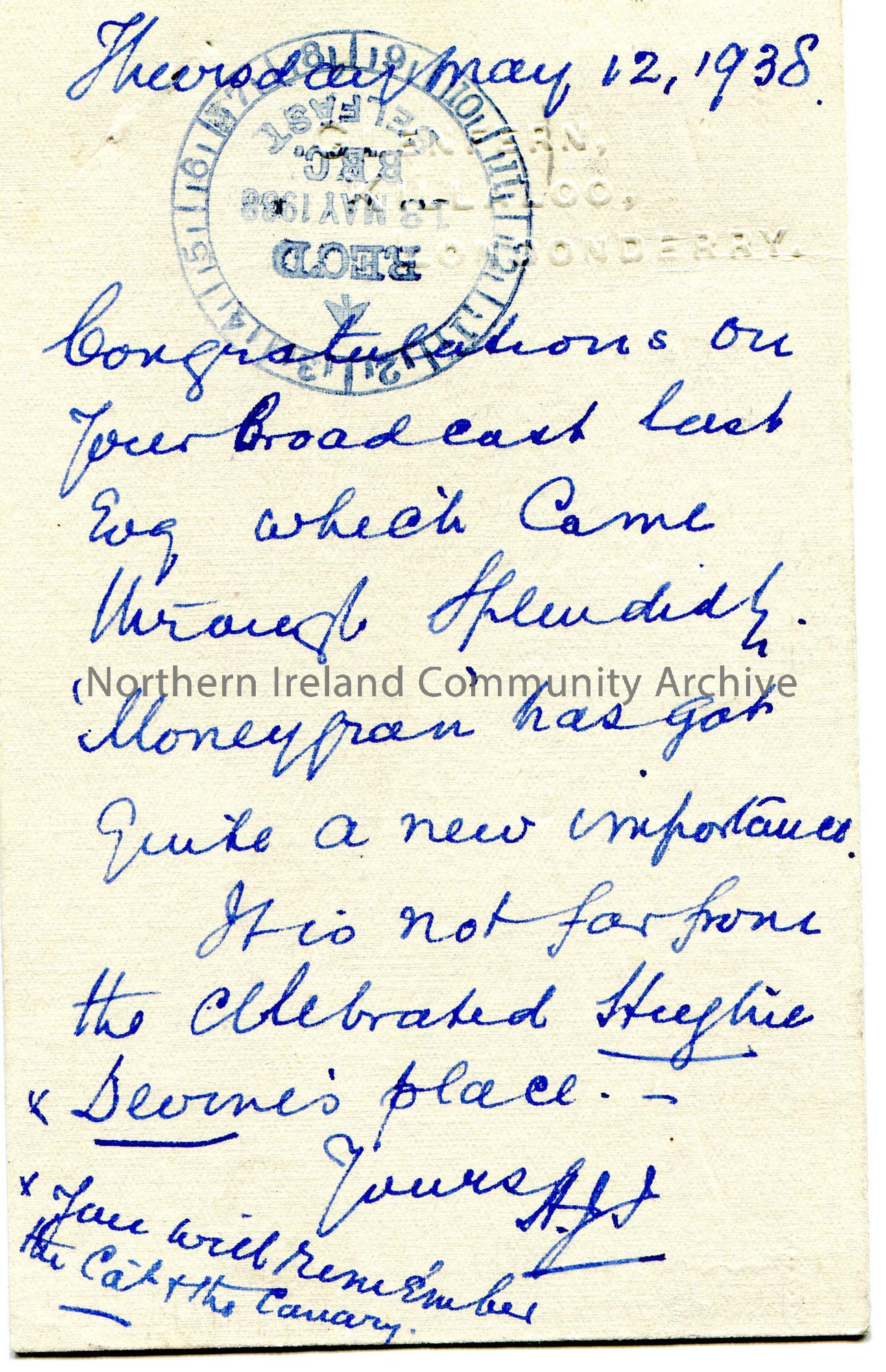 Handwritten postcard addressed to Sam Henry, Sandelford, Coleraine. Red 1D George VI stamp on front. 'From Mr Albert J. Irwin, J.P. F.R.S.A Chairman of Londonderry Board. Well-known antiquary and authority on the Sperrins' typed on front and initialled 'S.H'. Congratulates Sam on his broadcast and will remember 'the cat and the canary'. Received stamp to the BBC on back dated 18th May 1938.