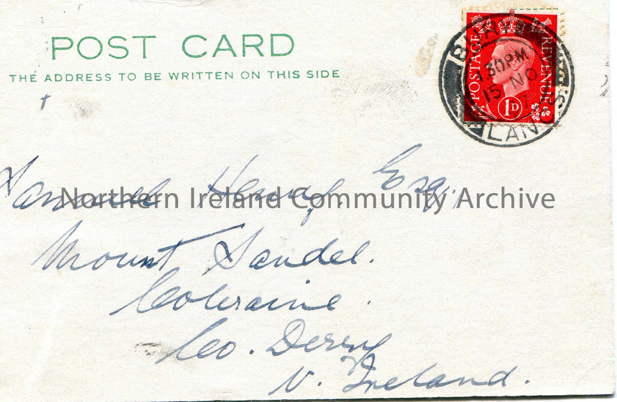 Handwritten postcard to Mr Henry, Mountsandel, Coleraine. Red postage stamp of King George VI. Number ‘3’ written at top corner on back in pencil. Wri…
