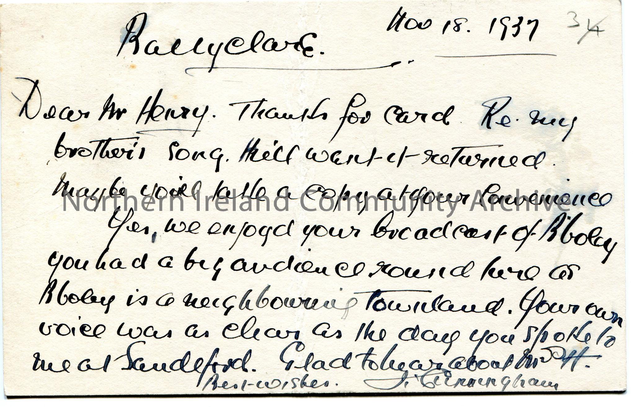 Handwritten postcard to Mr Henry, Sandelford, Coleraine. Red postage stamp of King George VI. Received stamp of BBC Belfast 20th November 1937 on front. Number '3' written stop corner on back, '4' is scored out. Would like his brother's song returned. Enjoyed the broadcast re Ballyboley. Notes that his voice was clear during the broadcast.