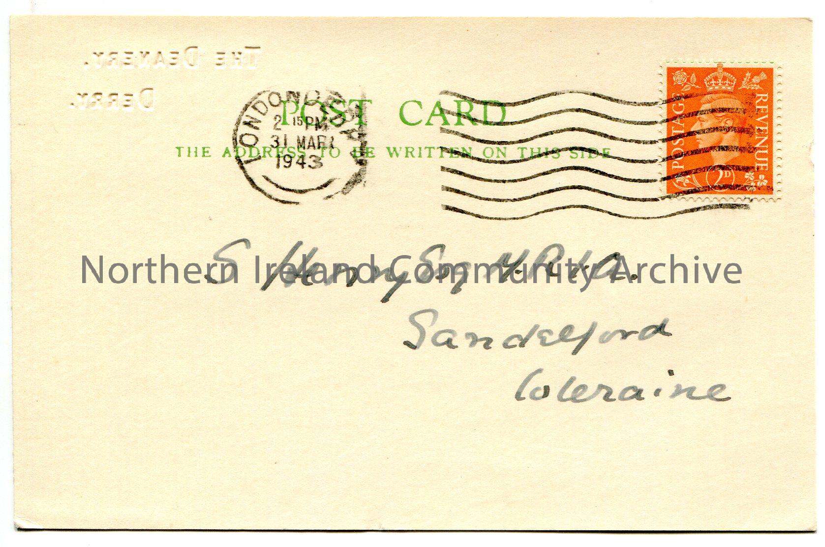 Handwritten postcard to S. Henry, Esq., Sandelford, Coleraine. Red 2d King George VI postage stamp on front. They have completed a search for Sam re s…