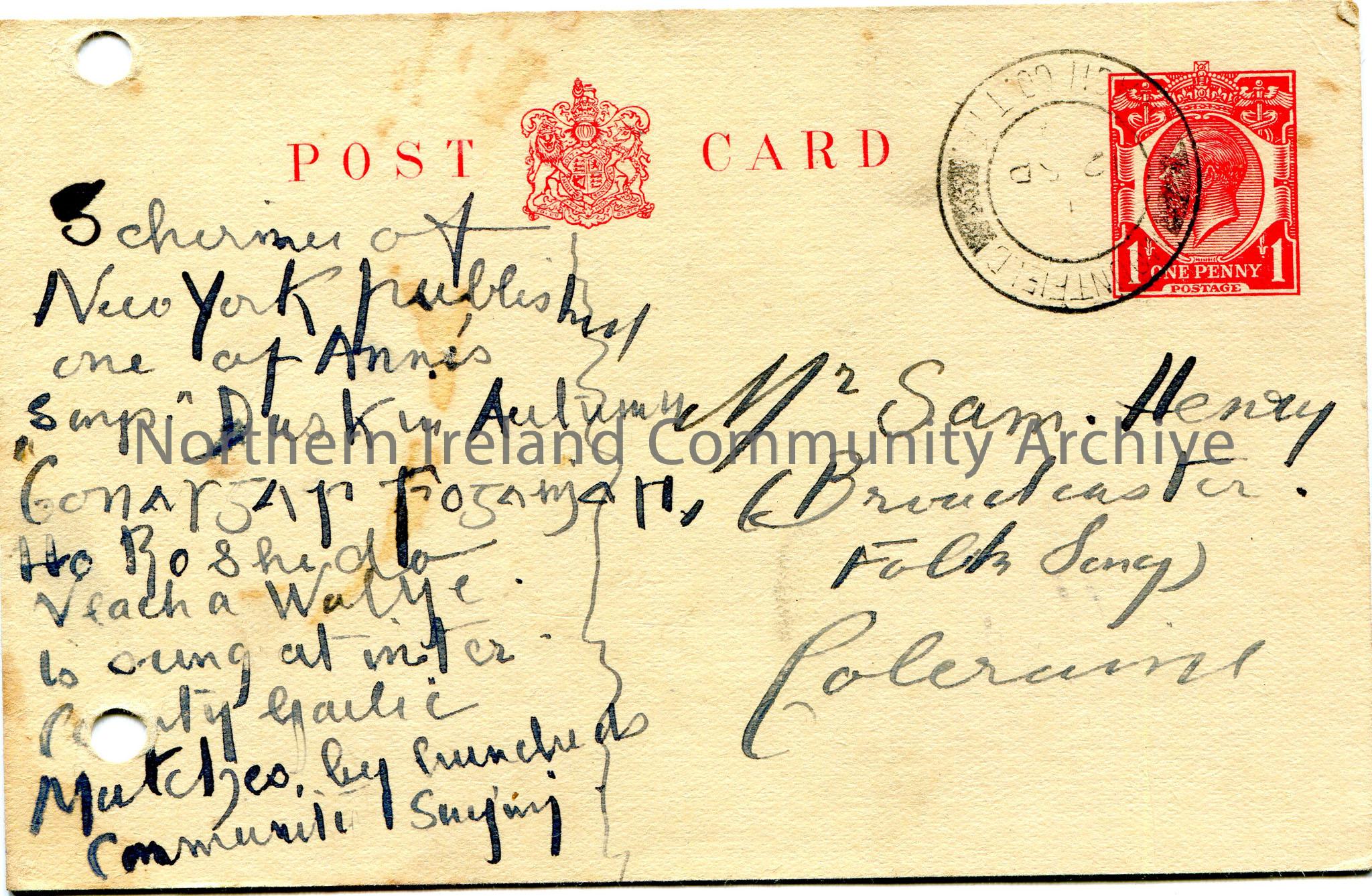 Handwritten postcard to Sam Henry, Broadcaster Folk Song, Coleraine. One penny red postage stamp pre printed onto postcard of George V. See CM:2017:1292 for transcription of postcard.