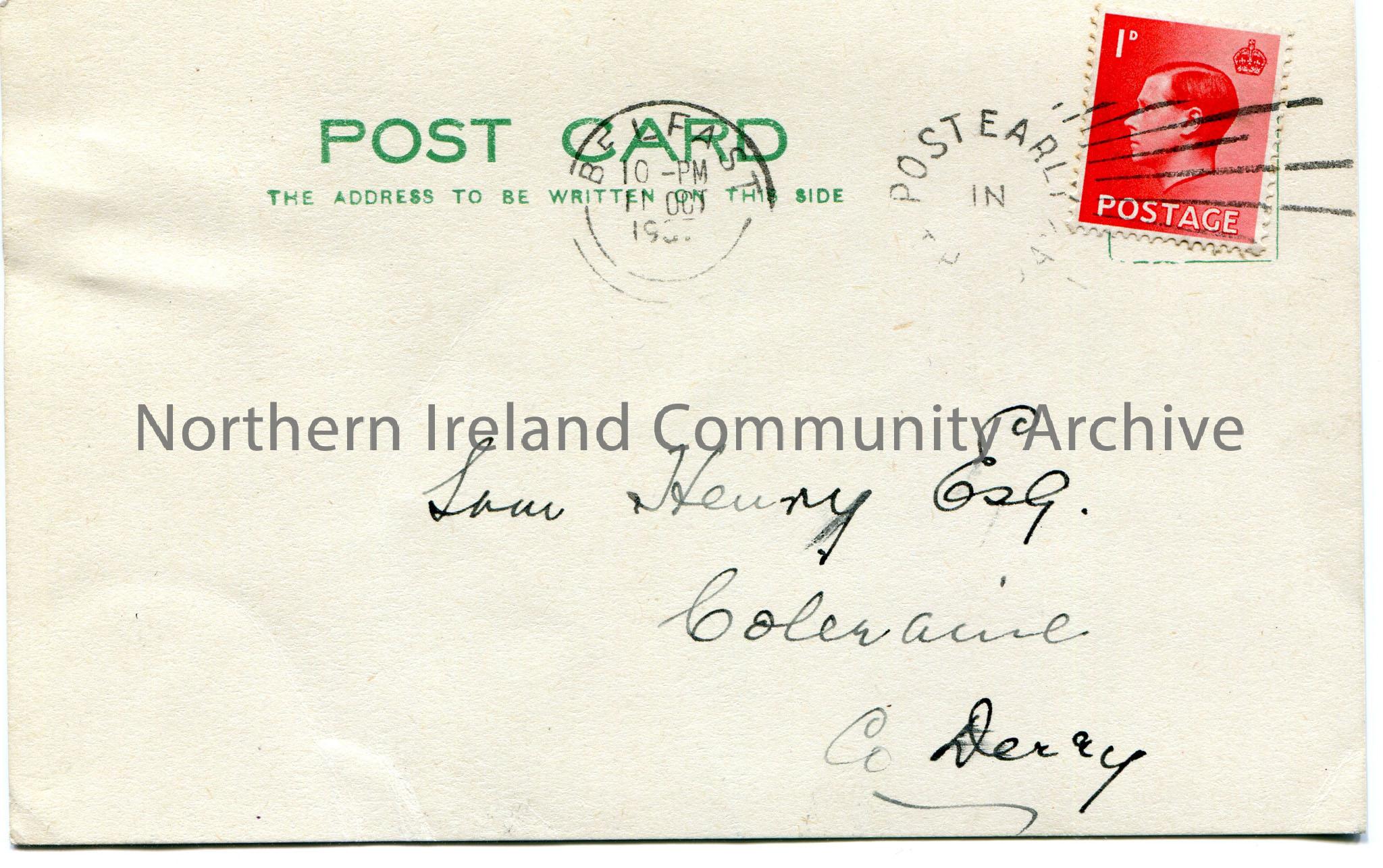 Handwritten postcard to Sam Henry, Coleraine, Co. Derry. Enjoyed Sam's talk on 13th re songs of Co. Antrim. Says that Sam deserves thanks for his 'labour' but calls it a 'labour of love.' Red postage stamp of Edward VIII on front.