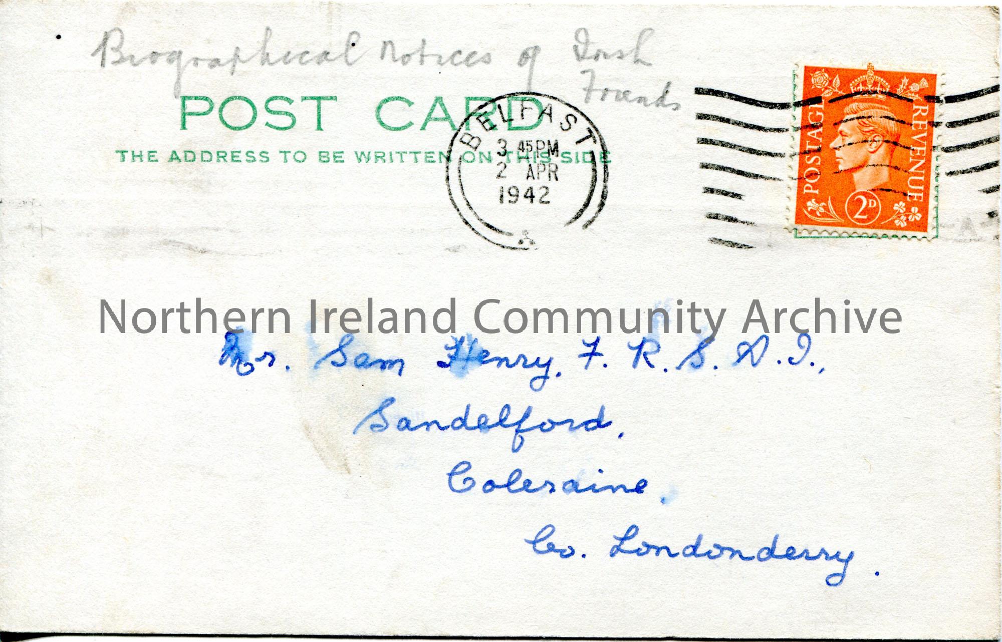 Handwritten postcard to Sam Henry from J. L. M. Stewart. Red King George VI postage stamp pasted to front. Conducted a search for Sam in their records re a Rev. William Whiteside of Derry.