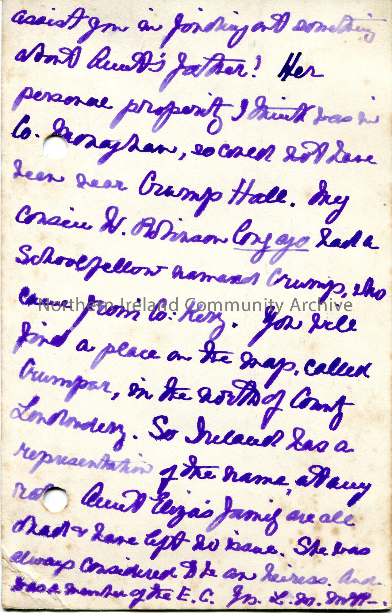 Handwritten postcard to Sam Henry from Lydia McRobert. Red 1 penny King George V postage stamp pasted to front. Writing re her relations of the name Crump.