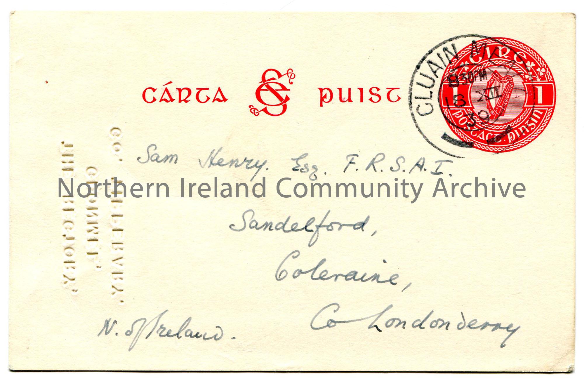 Handwritten postcard to Sam Henry, Sandelford, Coleraine, Co. Londonderry. Preprinted red Eire postal stamp on front along with date stamp of ‘Cluain …