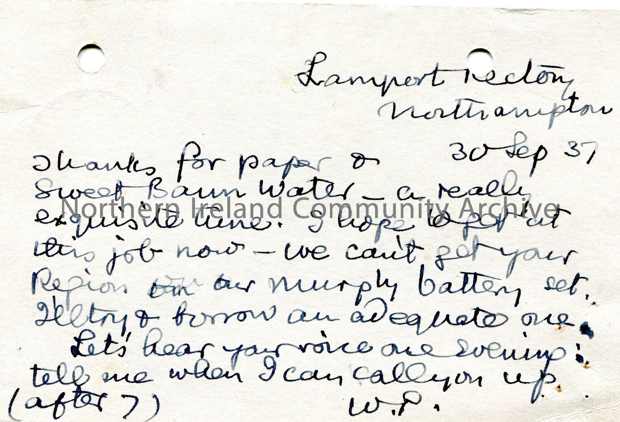Handwritten postcard to Sam Henry, Sandelford, Coleraine, N. Ireland. Date stamped as 30th September, 1937, Lamport, Northampton. Red postage stamp of George VI. Thanks Sam for the paper on 'Sweet Bann Water'. Cannot get the region to listen to Sam on the radio. Would like to call Sam sometime after 7.