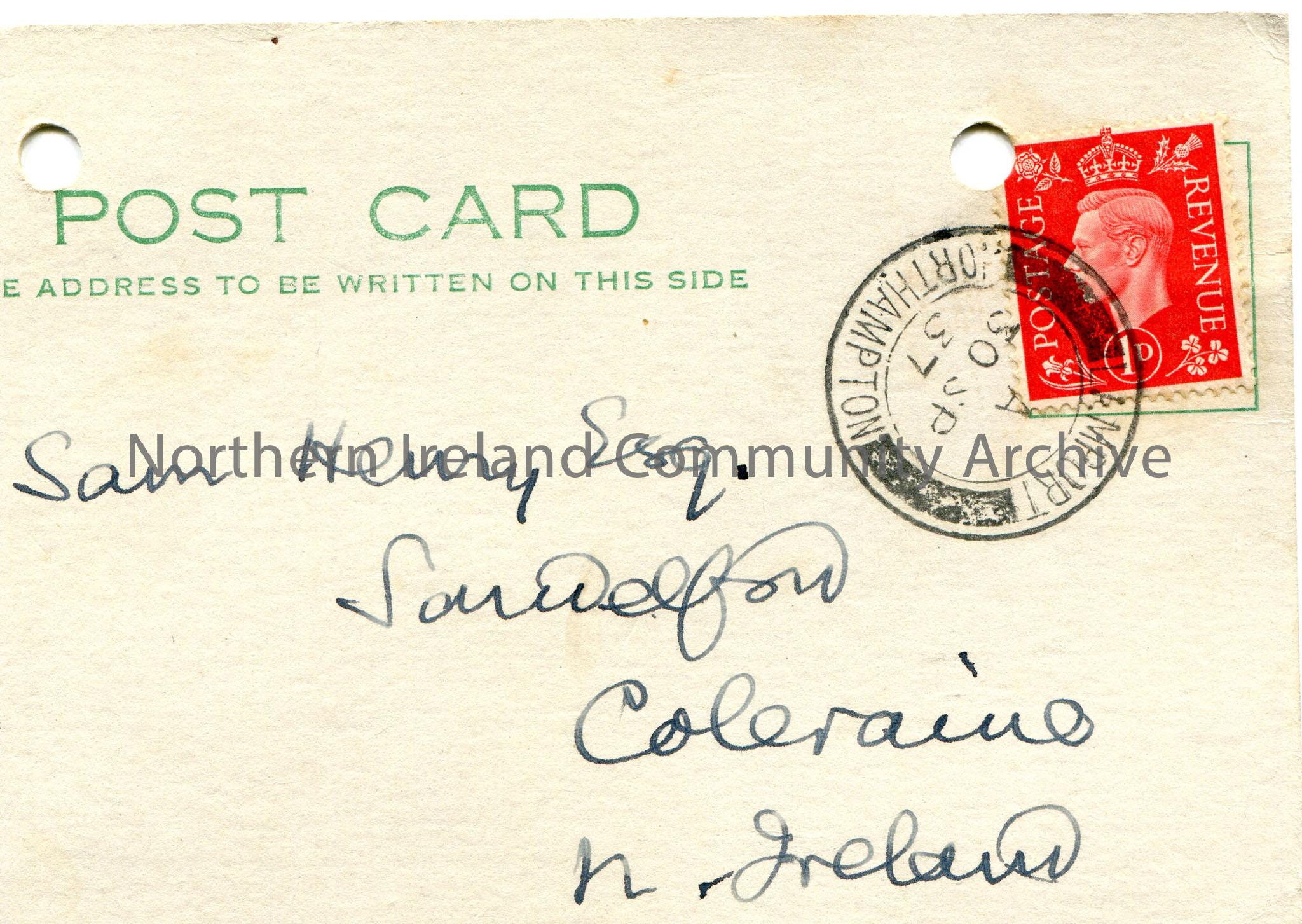 Handwritten postcard to Sam Henry, Sandelford, Coleraine, N. Ireland. Date stamped as 30th September, 1937, Lamport, Northampton. Red postage stamp of…