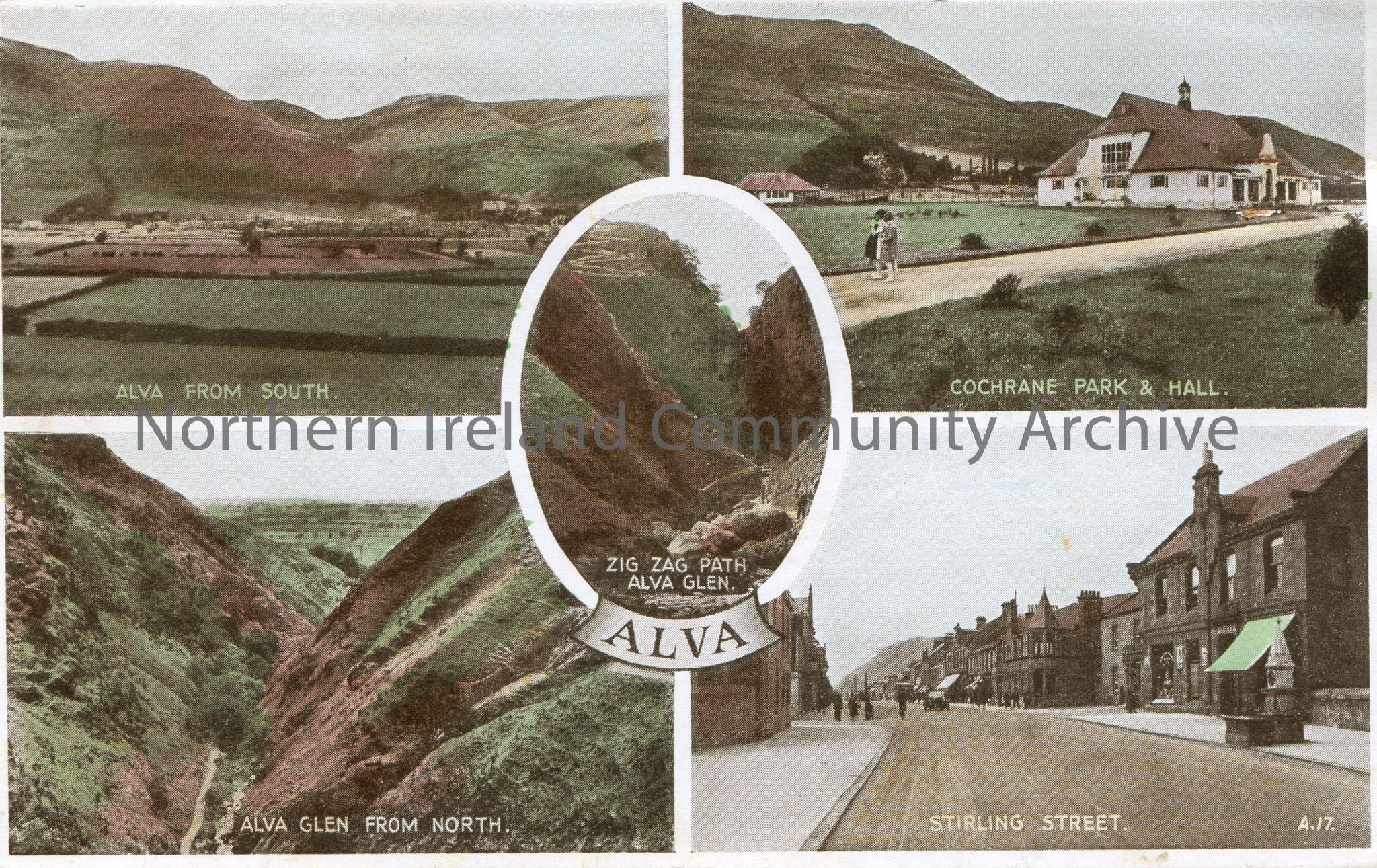 Handwritten postcard to Sam Henry, Sandelford, Coleraine. Postcard with five images re Alva Glen. Thanks Sam for his letter. Praises Sam’s ‘Heritage o…