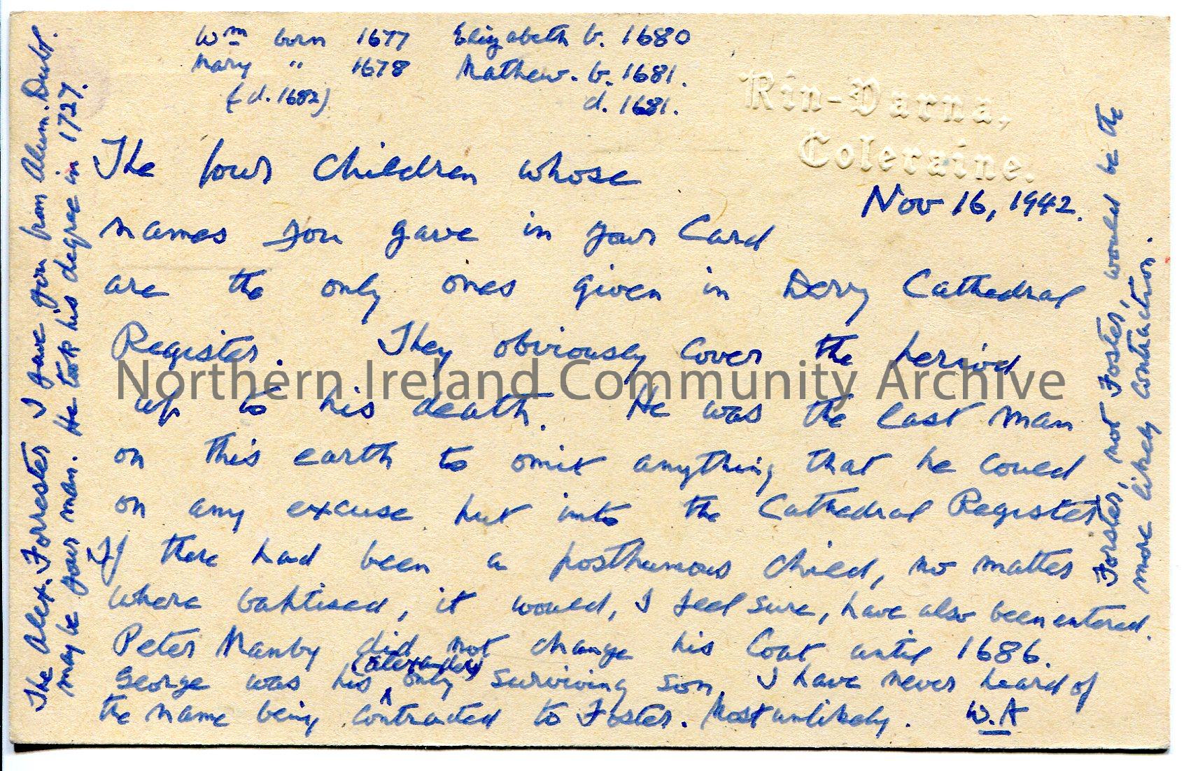Handwritten postcard to Sam Henry, Sandelford, Coleraine. Preprinted red 2d George VI postage stamp on front. Helping Sam with his research re Foster surname. They have searched the Derry Cathedral Registers.