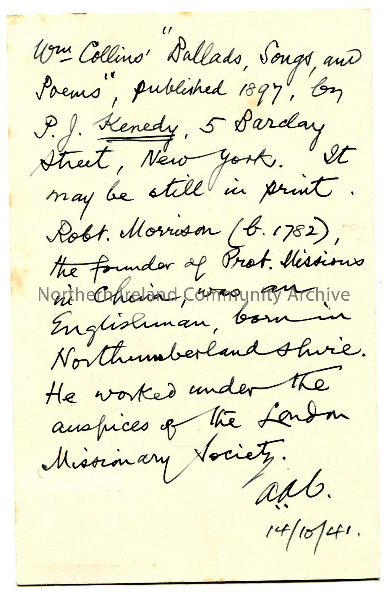 Handwritten postcard to Sam Henry, Sandelford, Coleraine. Red 2D King George VI postage stamp on front. Date stamped Belfast 4.45pm 14 Oct 1941'. Brief note re William Collins 'Ballads, Songs and Poems' published 1897 and Robert Morrison, founder of Prot[estant] Missions in China for the London Missionary Society.