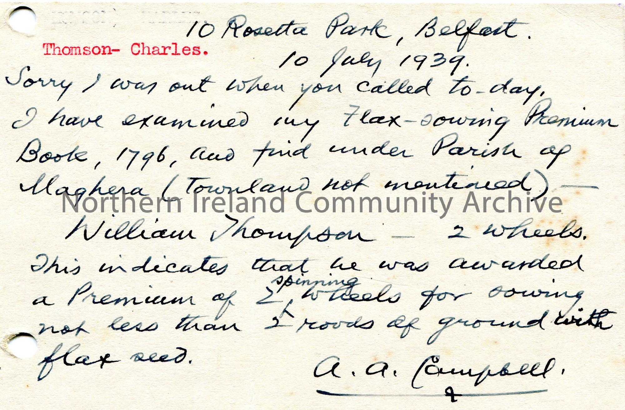 Handwritten postcard to Sam Henry, Sandelford, Coleraine. Red King George VI stamp on front. Date stamped as Belfast, 10th July, 1939. Re Charles Thomson. Searched his 'Flax-Sowing Premium Book' of 1796 for Sam and found William Thompson was awarded two spinning wheels.