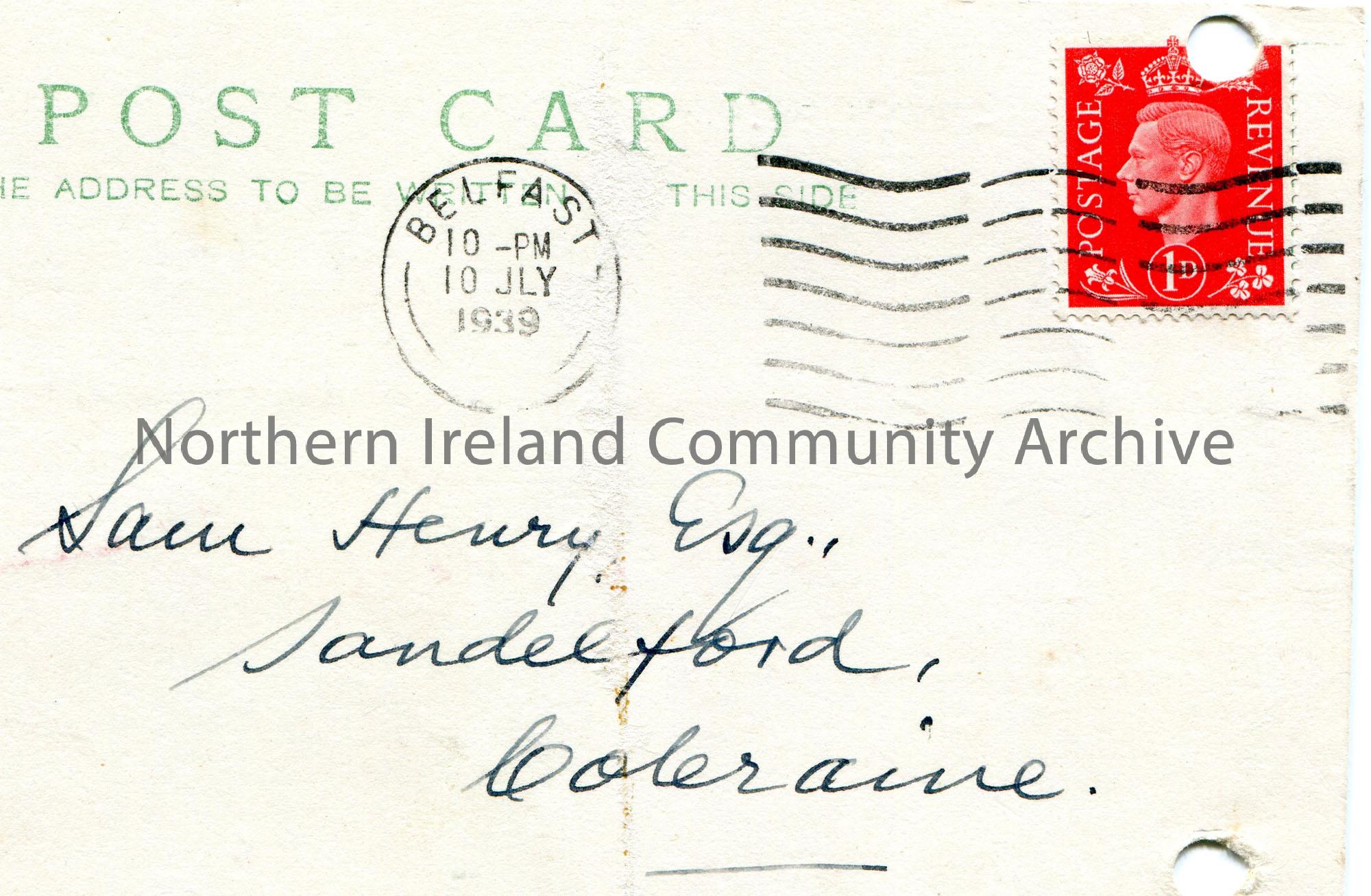 Handwritten postcard to Sam Henry, Sandelford, Coleraine. Red King George VI stamp on front. Date stamped as Belfast, 10th July, 1939. Re Charles Thom…