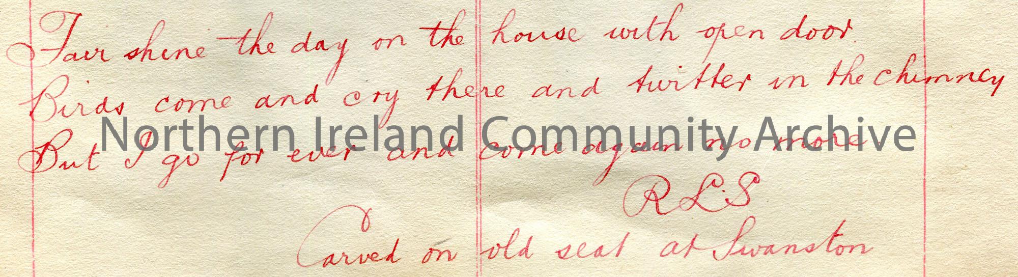 Handwritten quote. States that it was carved on an old seat at Swanston. Initialled R L S. Begins, ‘Fair shine the day on the house with open door…’