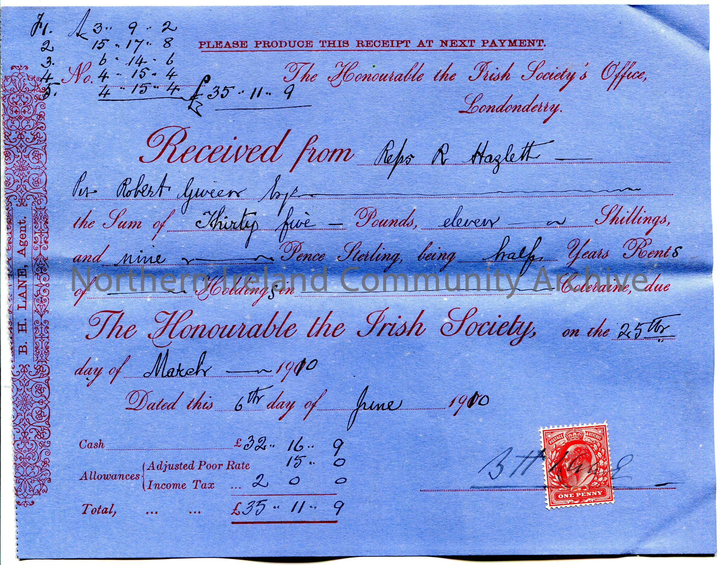 Handwritten receipt (blue paper) for payment from R Hazlett [Hezlet] per Robert Giveen to The Honourable the Irish Society for the sum of £35.11.9. Payment for half a years rent of holdings in Coleraine due 25th March, 1910. Receipt dated 6th June, 1910. Signature of B H Lane, Agent over red one penny Edward VII postage stamp. Numerical calculation handwritten on back of receipt.