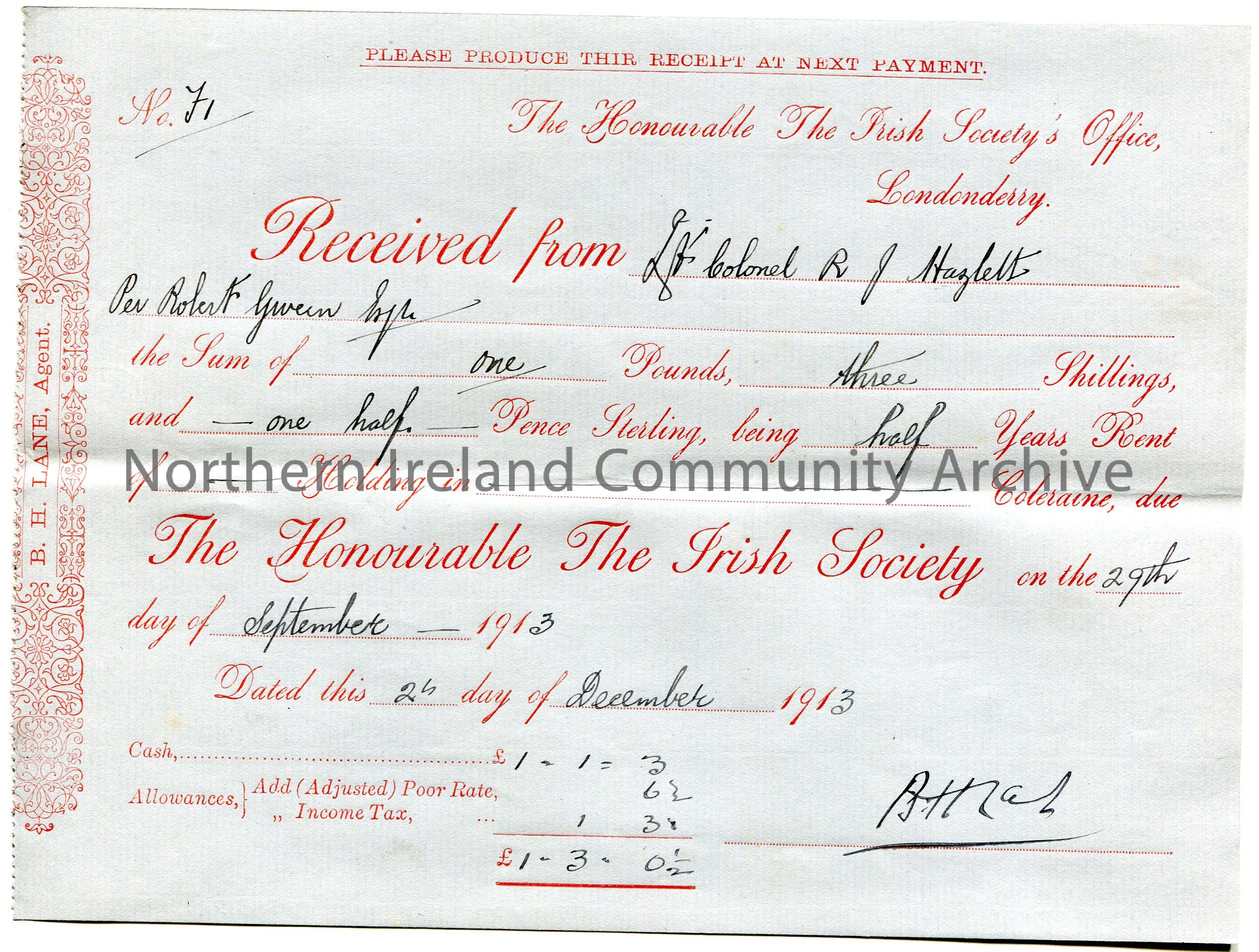 Handwritten receipt (blue paper) no. 1 for payment received from Colonel R J Hazlett [Hezlet] per Robert Giveen to The Honourable The Irish Society for the sum of £1.3.0 1/2. Payment for a half years rent for a holding in Coleraine on 29th September, 1913. Receipt dated 2nd December, 1913. Signed by B. H. Lane, Agent.