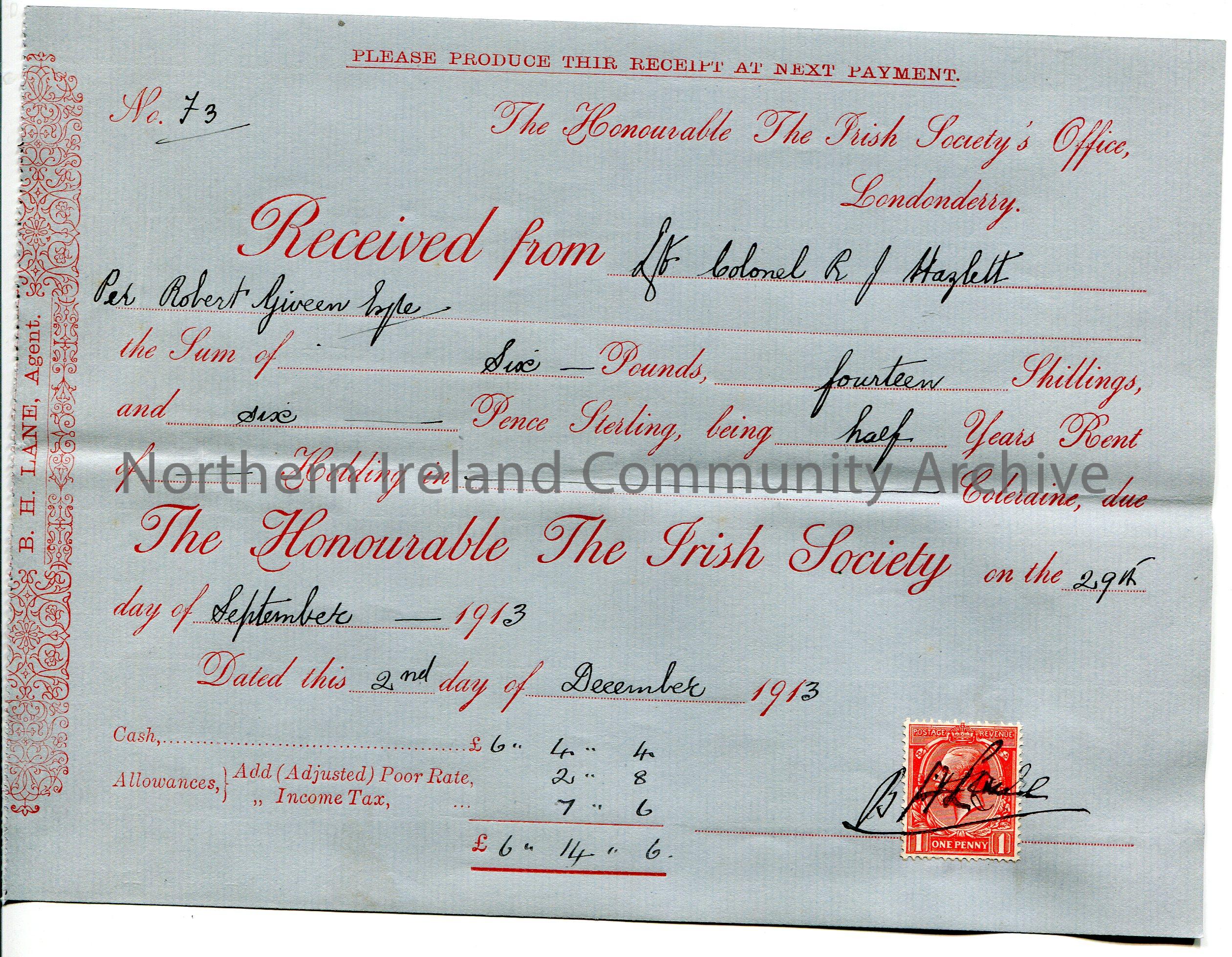 Handwritten receipt (blue paper) no. 3 for payment received from Colonel R J Hazlett [Hezlet] per Robert Giveen to The Honourable The Irish Society for the sum of £6.14.6. Payment for a half years rent for a holding in Coleraine on 29th September, 1913. Receipt dated 2nd December, 1913. Signed by B. H. Lane, Agent over red one penny George V postage stamp.