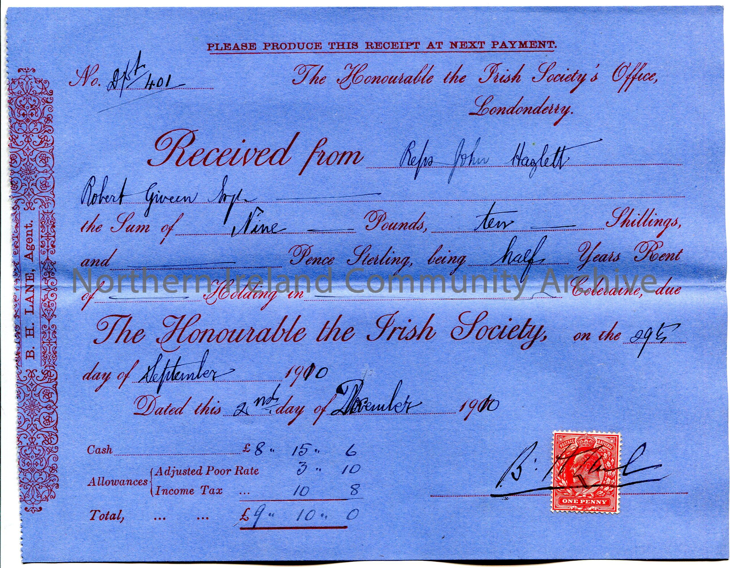 Handwritten receipt (blue paper), No. 401, for payment from John Haslett [Hezlet] per Robert Giveen to The Honourable the Irish Society for the sum of £9.10.0. Payment for half a years rent of a holding in Coleraine due 29th September, 1910. Receipt dated 2nd December, 1910. Signature of B H Lane, Agent over red one penny Edward VII postage stamp.
