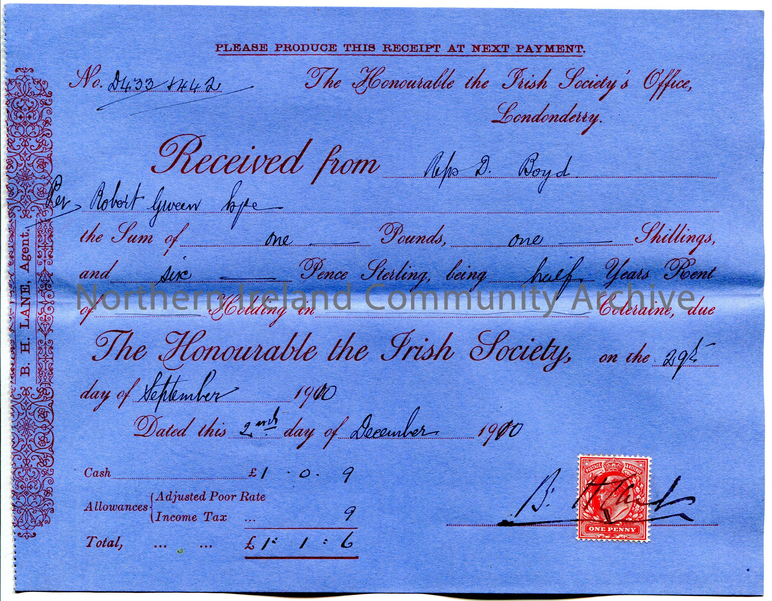 Handwritten receipt (blue paper), No. 433 and 442, for payment from D Boyd per Robert Giveen to The Honourable the Irish Society for the sum of £1.1.6. Payment for half a years rent of a holding in Coleraine due 29th September, 1910. Receipt dated 2nd December, 1910. Signature of B H Lane, Agent over red one penny Edward VII postage stamp.
