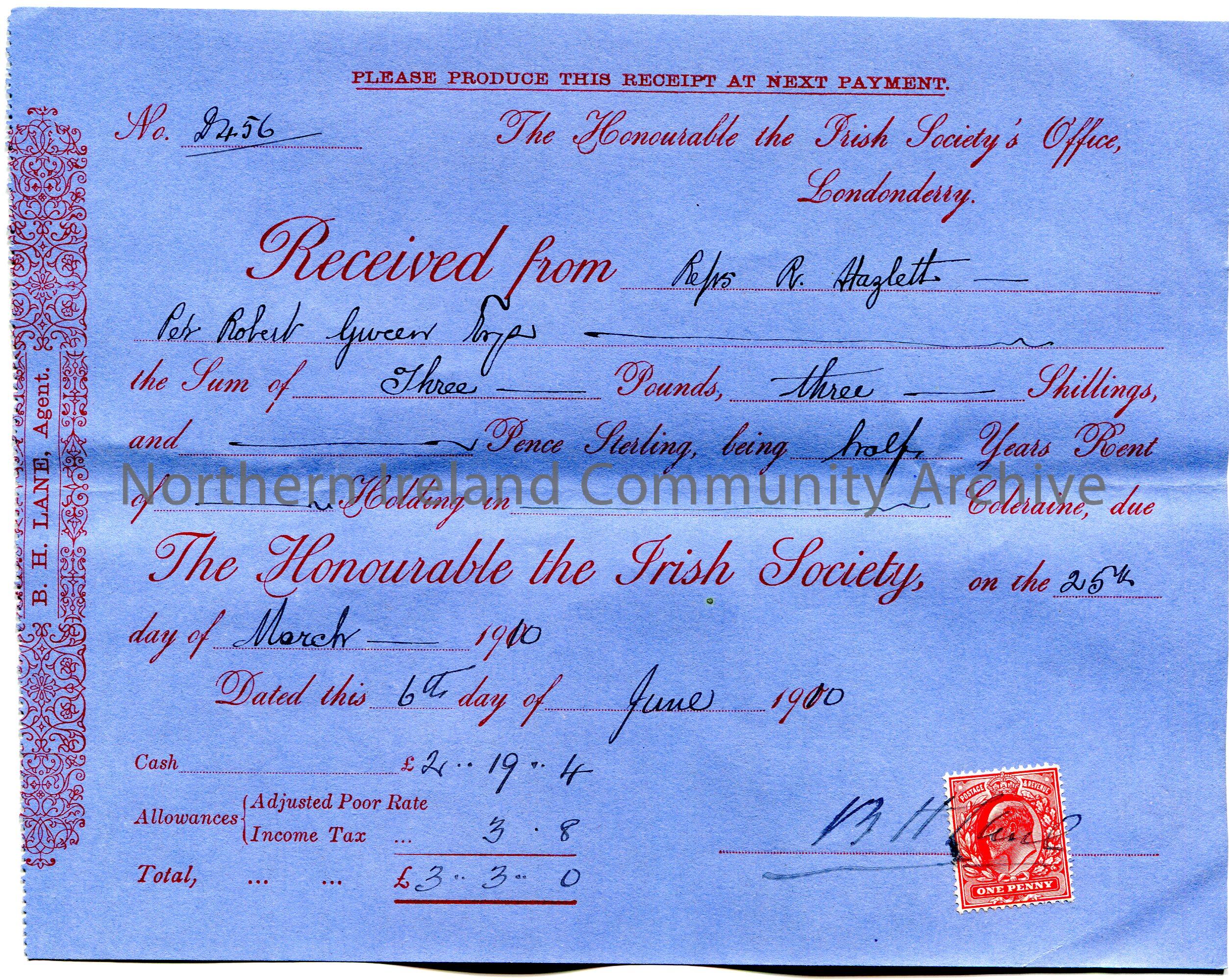 Handwritten receipt (blue paper), No. 456, for payment from R Hazlett [Hezlet] per Robert Giveen to The Honourable the Irish Society for the sum of £3.3.0. Payment for half a years rent of a holding in Coleraine due 25th March, 1910. Receipt dated 6th June, 1910. Signature of B H Lane, Agent over one penny Edward VII postage stamp.