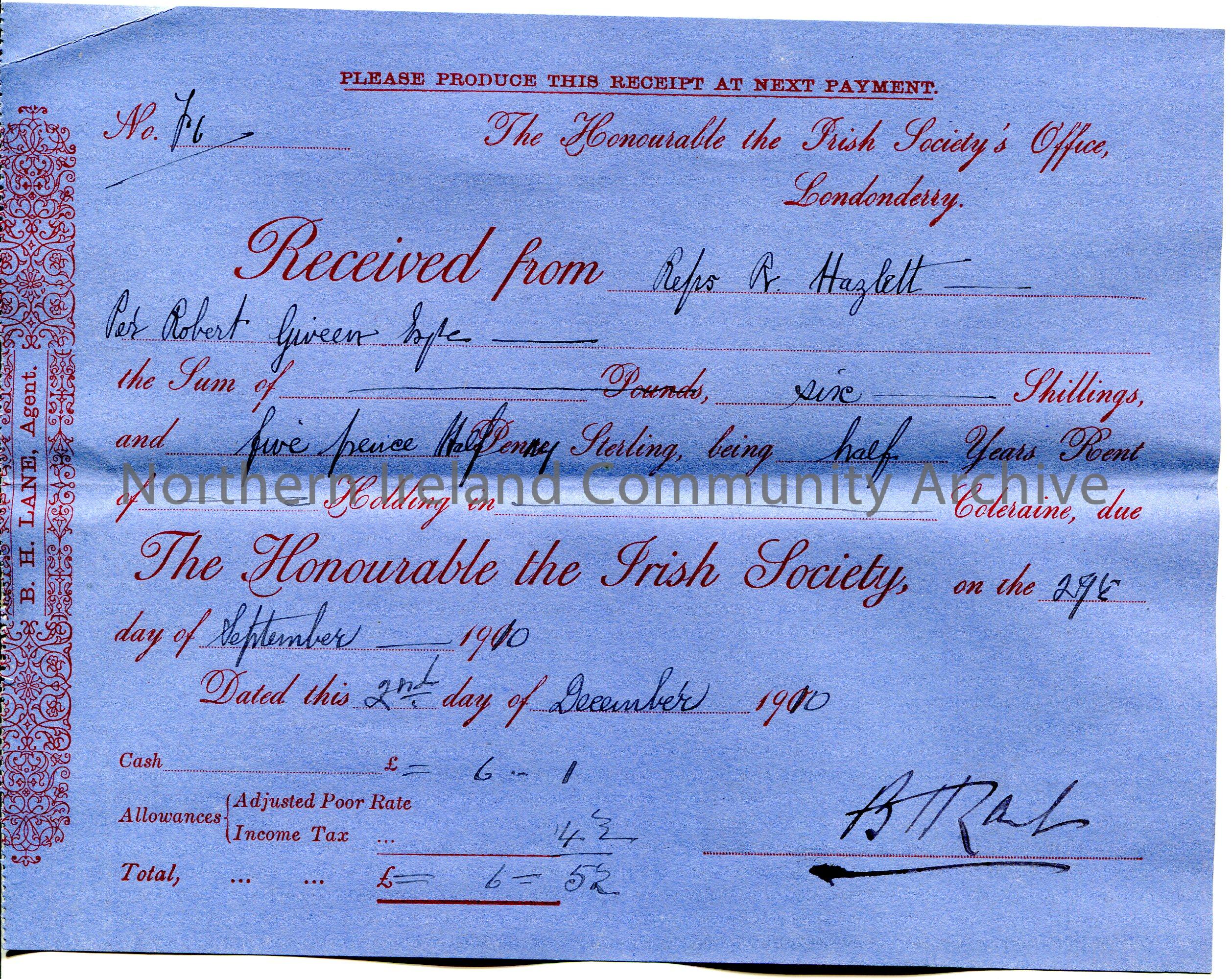 Handwritten receipt (blue paper), No. 6, for payment from R Hazlett [Hezlet] per Robert Giveen to The Honourable the Irish Society for the sum of £0.6.5 1/2. Payment for half a years rent of a holding in Coleraine due 29th September, 1910. Receipt dated 2nd December, 1910. Signature of B H Lane, Agent.