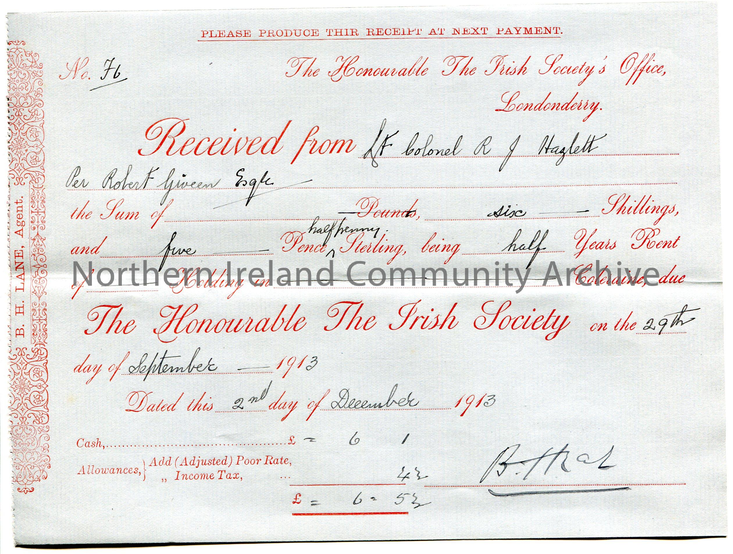 Handwritten receipt (blue paper) no. 76 for payment received from Colonel R J Hezlett [Hezlet] per Robert Giveen to The Honourable The Irish Society for the sum of £0.6.5 1/2. Payment for a half years rent for a holding in Coleraine on 29th September, 1913. Receipt dated 2nd December, 1913. Signed by B. H. Lane, Agent.