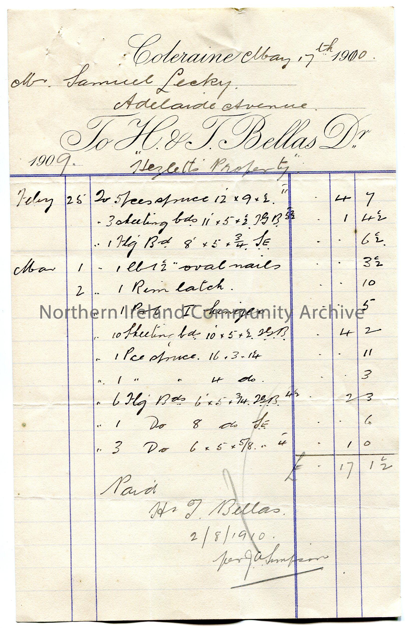 Handwritten receipt dated 17th May, 1910, for payment by Mr Samuel Lecky, Adelaide Avenue, to H & T Bellas, Coleraine, for sum of £0.17.1 1/2 for materials for 'Hezlett's [Hezlet] Property' in February and March 1909. Paid on 2nd August, 1910. Signed by ? A Simpson. 'Bellass. Aug, 1910' handwritten at top right of page.