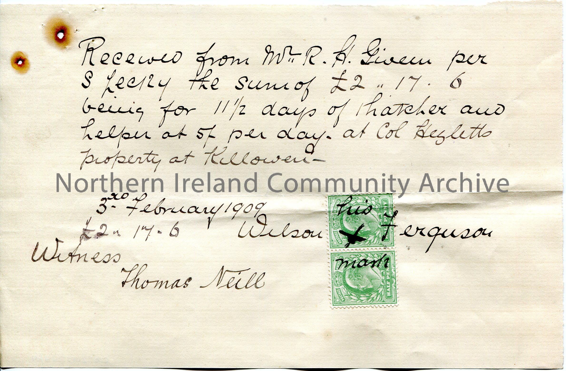 Handwritten receipt for 11 1/2 days thatching plus help at Col Hezlett's [Hezlet] property at Killowen. Payment received from Mr R H Giveen for S [Samuel] Lecky for sum of £2.17.6. Paid 3rd February, 1909. Signed Wilson Ferguson. Two green Edward VII half penny stamps stuck to receipt.