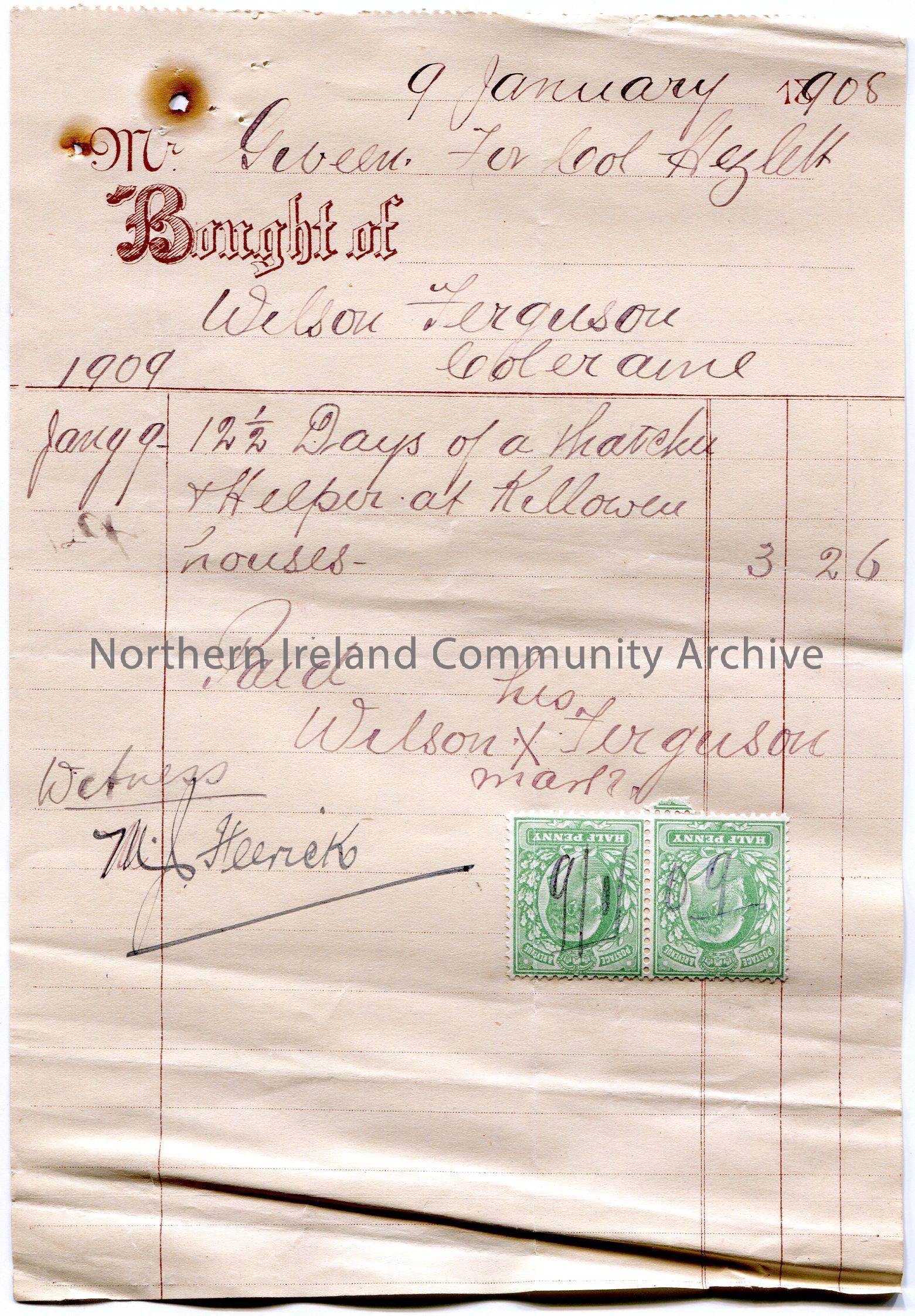 Handwritten receipt for 12 1/2 days of thatching of houses at Killowen. Payment of £3.2.6 to Wilson Ferguson of Coleraine by Mr Giveen for Col Hezlett [Hezlet]. Dated 9th January 1909. Two green Edward VII half penny stamps stuck to bottom of receipt.