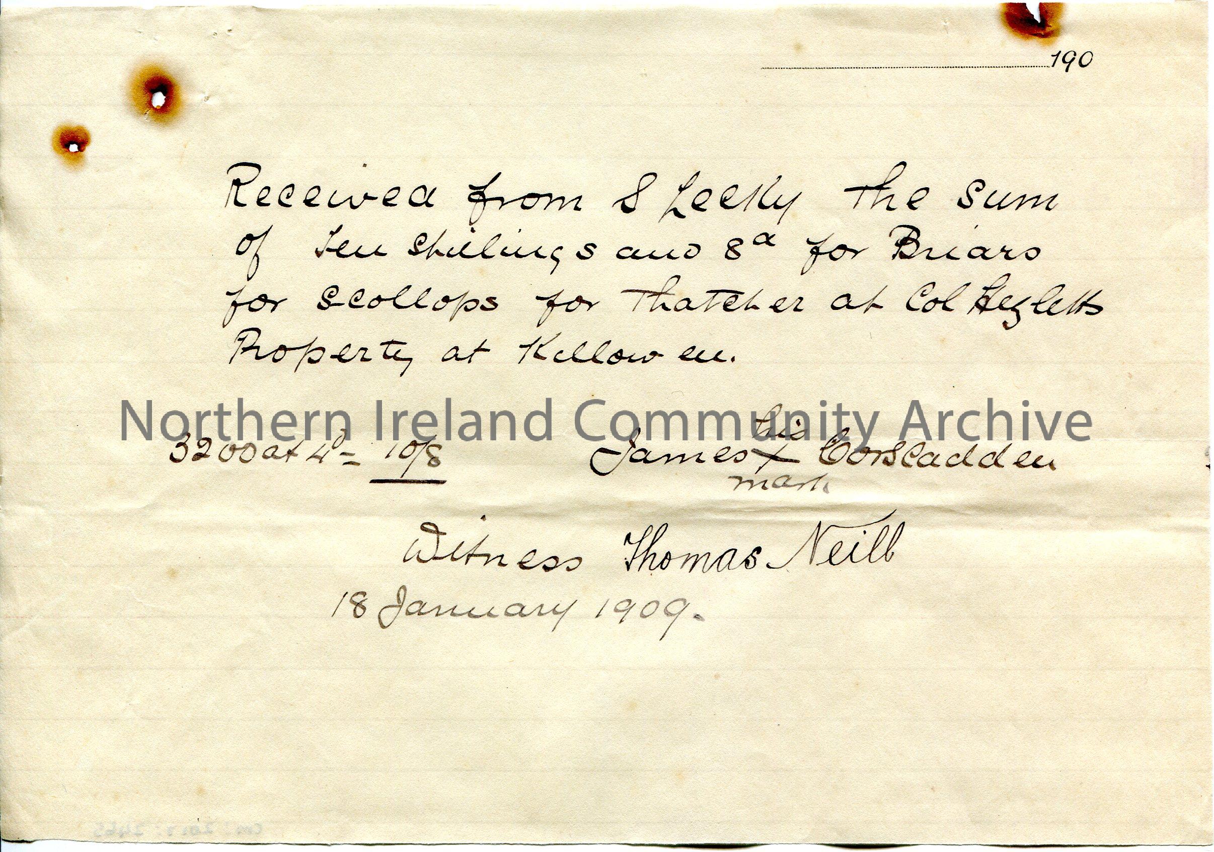 Handwritten receipt for briar for scallops for thatcher at Col Helmet's [Hezlet] property in Killowen. Payment of £0.10.8 from S [Samuel] Leck. Dated 18th January, 1909. Signed James Corsican. Witness Thomas Neill.