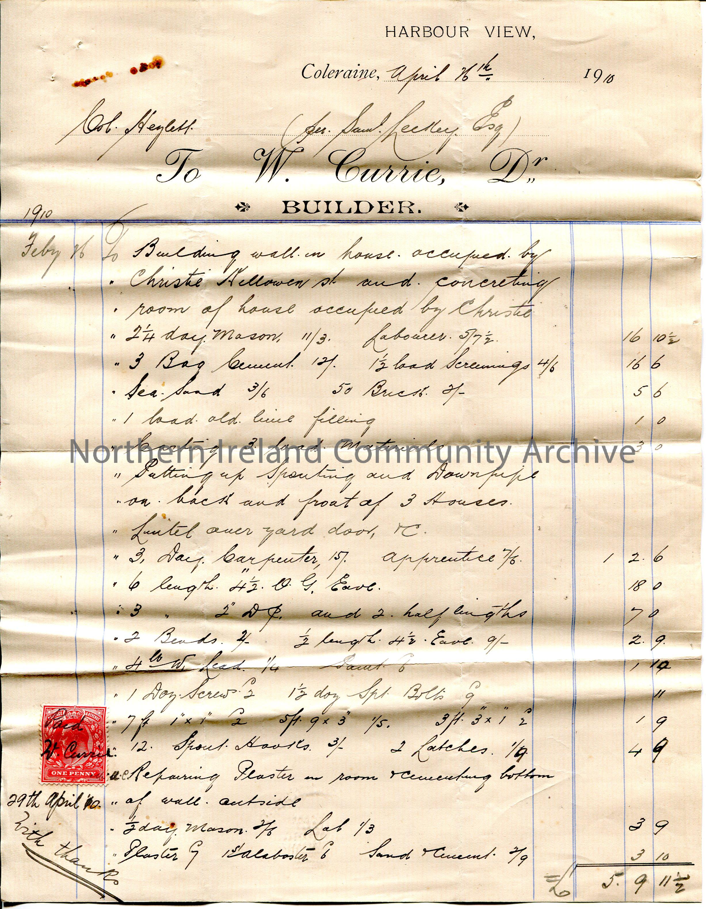 Handwritten receipt for Col Hezlett [Hezlet] per Samuel Lecky, Esq for payment of £5.9.11 1/2 to W. Currie, builder, Harbour View, Coleraine. Receipt dated 16th April, 1910 for building work, including materials, on 16th February, 1910 at a house occupied by 'Christie'. Signed by W Currie across red one penny Edward VII postage stamp and dated 29th April, 1910.
