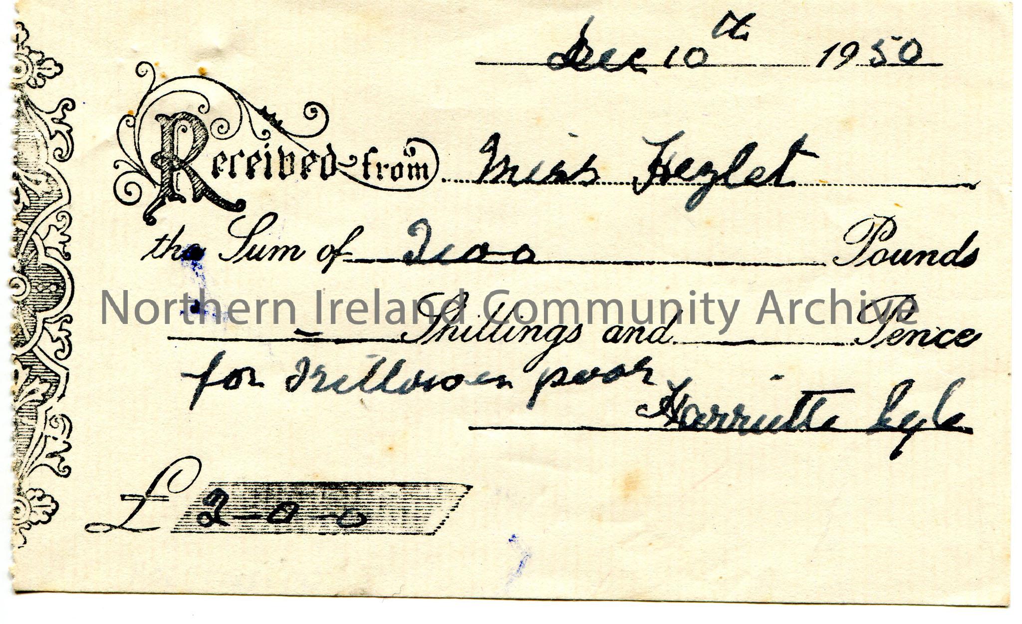 Handwritten receipt for Miss Hezlet for the sum of £2.0.0 from Harriette Lyle for Killowen poor. Dated 10th December, 1950.