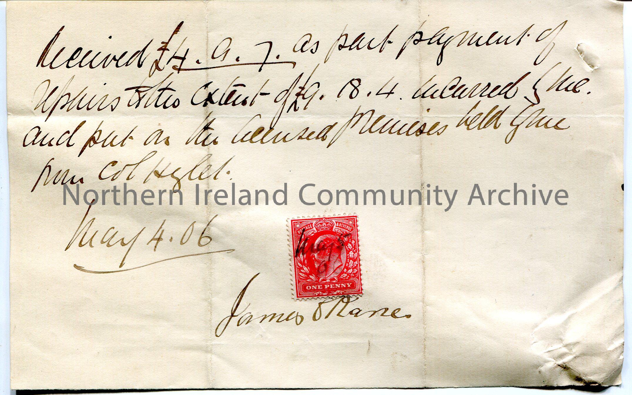 Handwritten receipt for part payment of £4.9.7 out of a total of £9.18.4. [Handwriting illegible]. Mentions Col Hezlet. Signed as James O'Kane. Dated 5th May, 1906 on top of red one penny King Edward VII postage stamp.