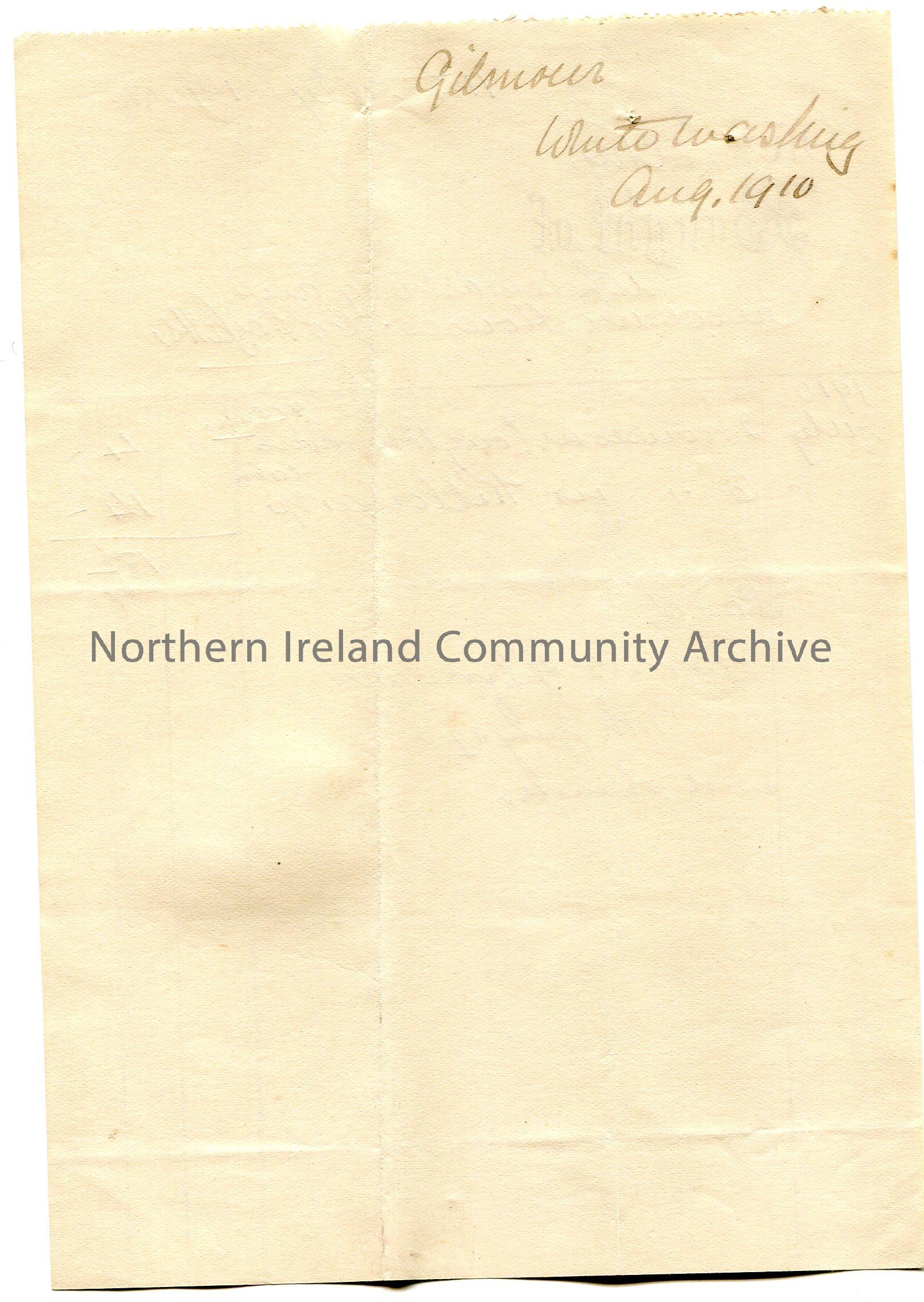 Handwritten receipt for payment by Mr [Samuel] Lecky to James Gilmour for sum of £0.18.0 for the white washing and repairing of Col Hezlett's [Hezlet]Houses. Work carried out in July 1910 on two houses on Long Commons and six in Killowen. Receipt dated and sum paid on 11th July 1910. 'Gilmour. White washing. Aug, 1910' handwritten on back of receipt.
