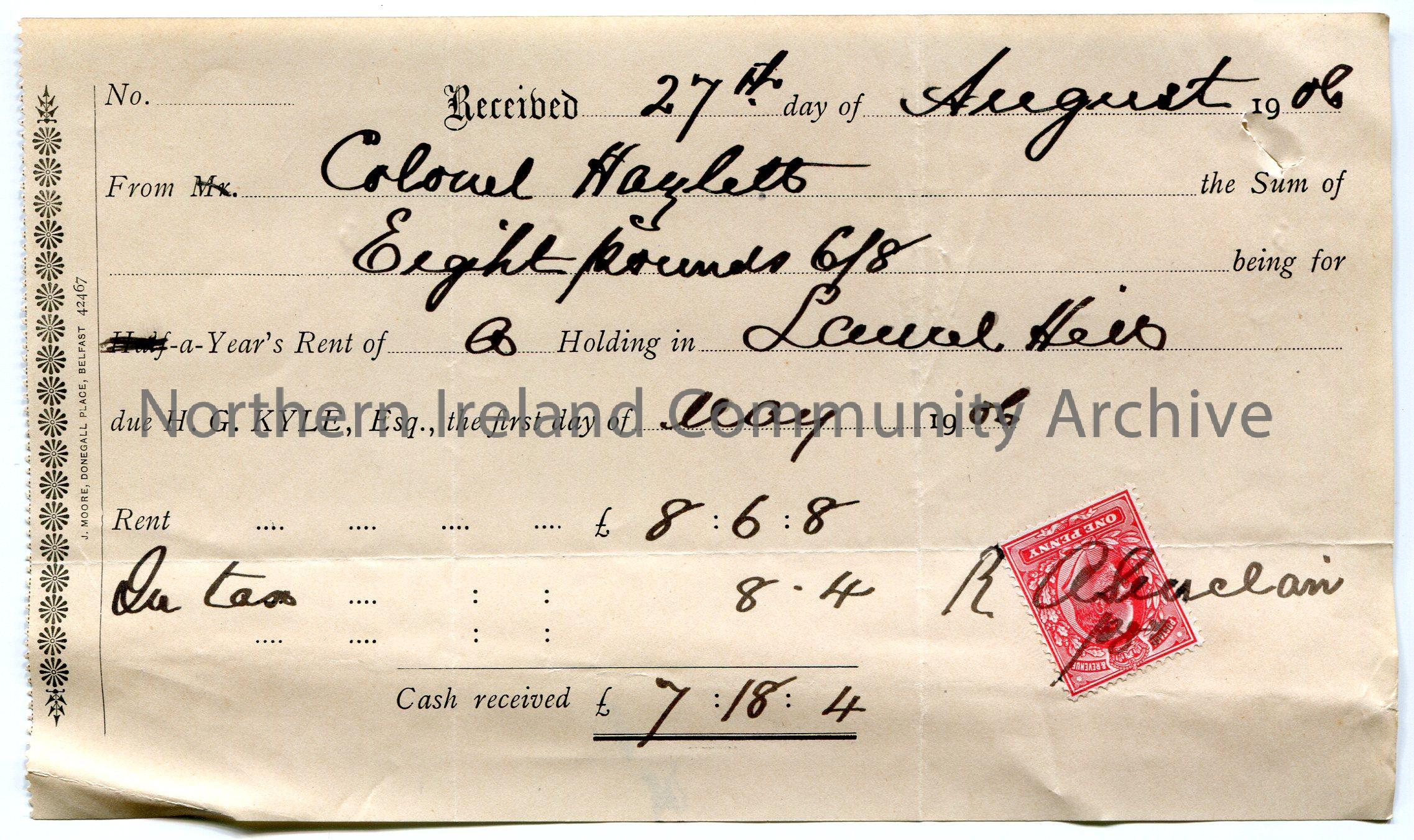 Handwritten receipt for payment from colonel Hezlett [Hezlet] for the sum of £8.6.8 for one years rent of a holding in Laurel Hill due H. G. Kyle, Esq., on 1st May, 1906. Total paid was £7.18.4 minus Income Tax. Signed by R. A? Red King Edward VII postage stamp on bottom right corner.