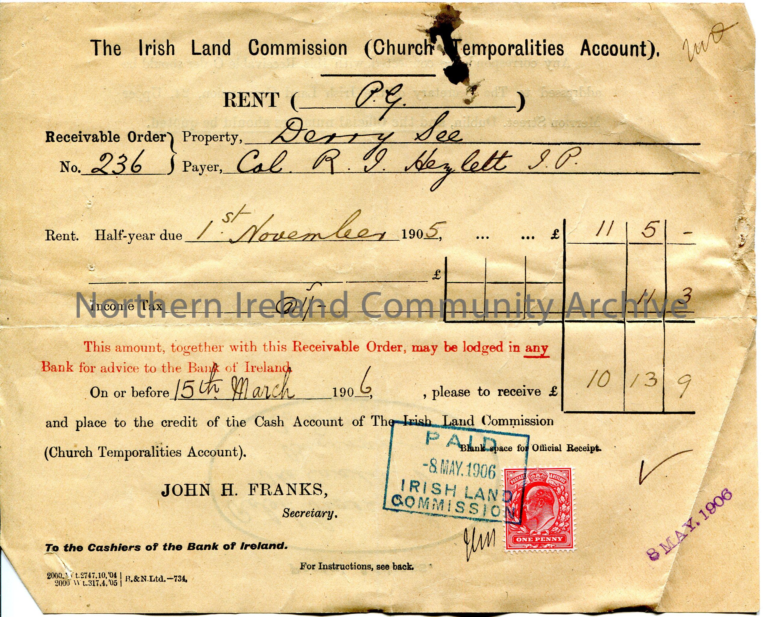Handwritten receipt for payment into the Cash Account of The Irish Land Commission. Receivable Order No. 236. Property - Derry See. Payer - Col. R. J. Hezlett [Hezlet]. For half year rent due, including Income Tax amounting to £10.13.9. Paid stamp dated 8th May, 1906 and red one penny Edward VII stamp on bottom half of page. Postal address given as Robert Giveen, Esq, The Castle, Buncrana, Co. Donegal.