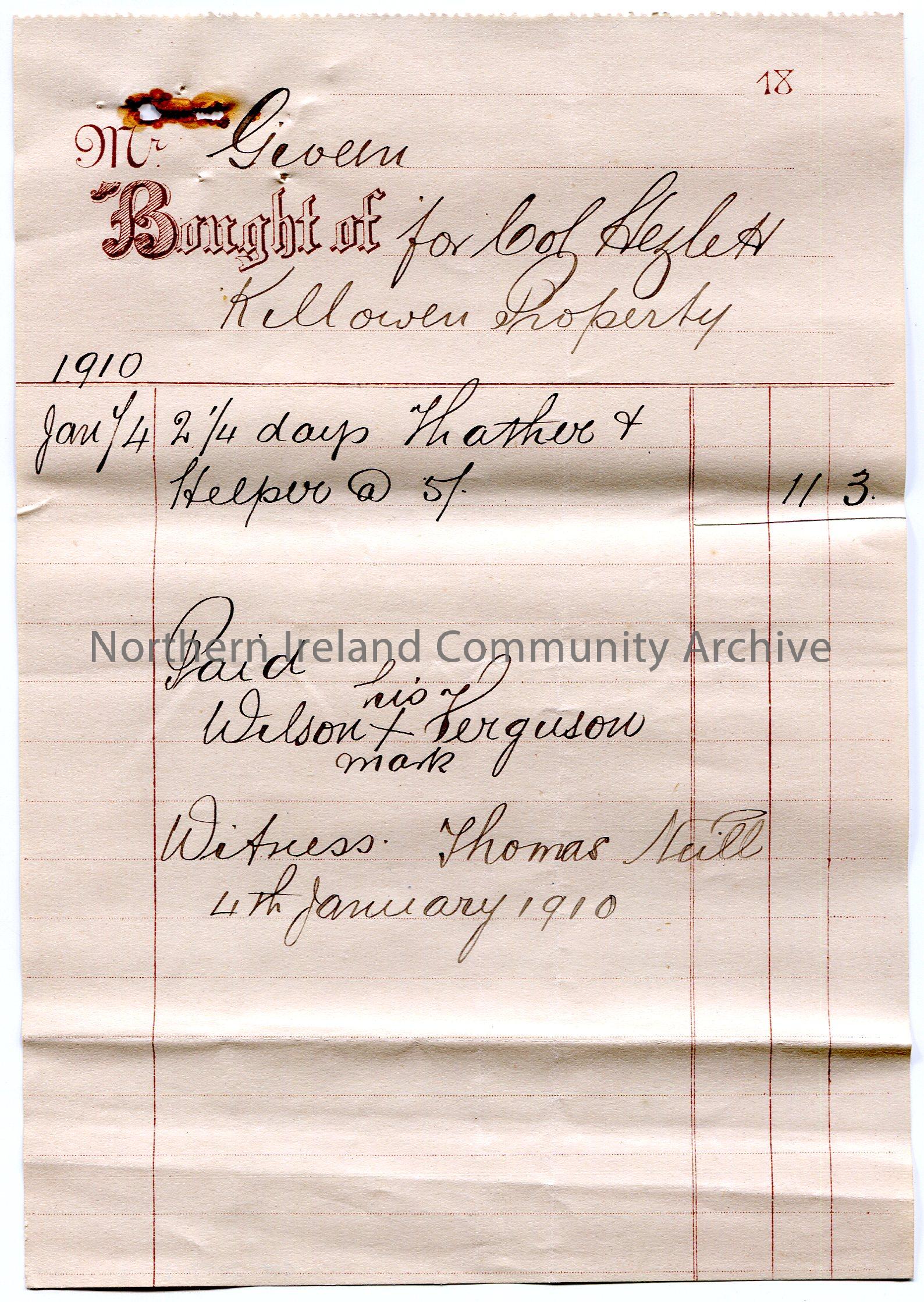 Handwritten receipt for payment of £0.11.3 from Mr [Robert] Giveen on behalf of Col Hezlett [Hezlet]. Payment to Wilson Ferguson for thatching at a property in Killowen which included 2 1/4 days work in January 1910. Payment received 4th January, 1910. Witness noted as Thomas Neill.