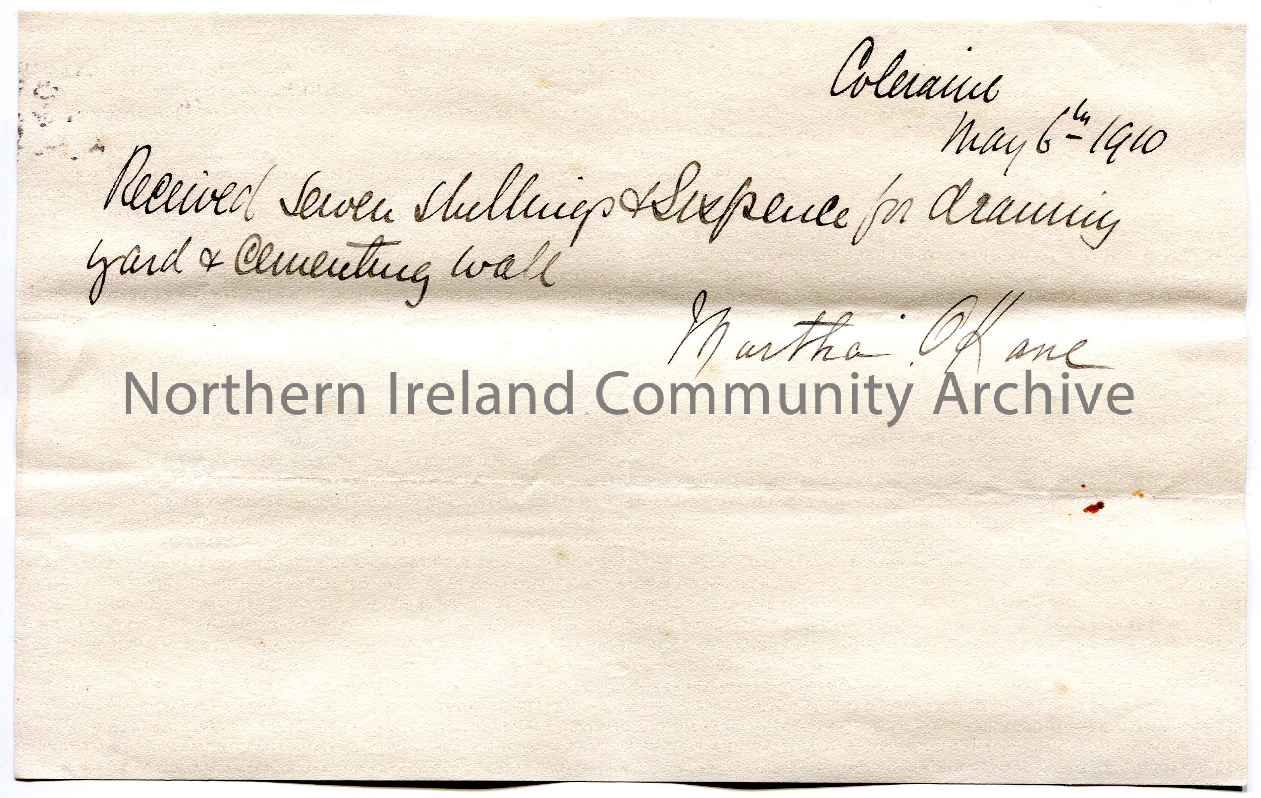 Handwritten receipt for payment of £0.7.6 for ‘draining yard and cementing wall. Signed by Martha O’Kane and dated Coleraine 6th May, 1910.