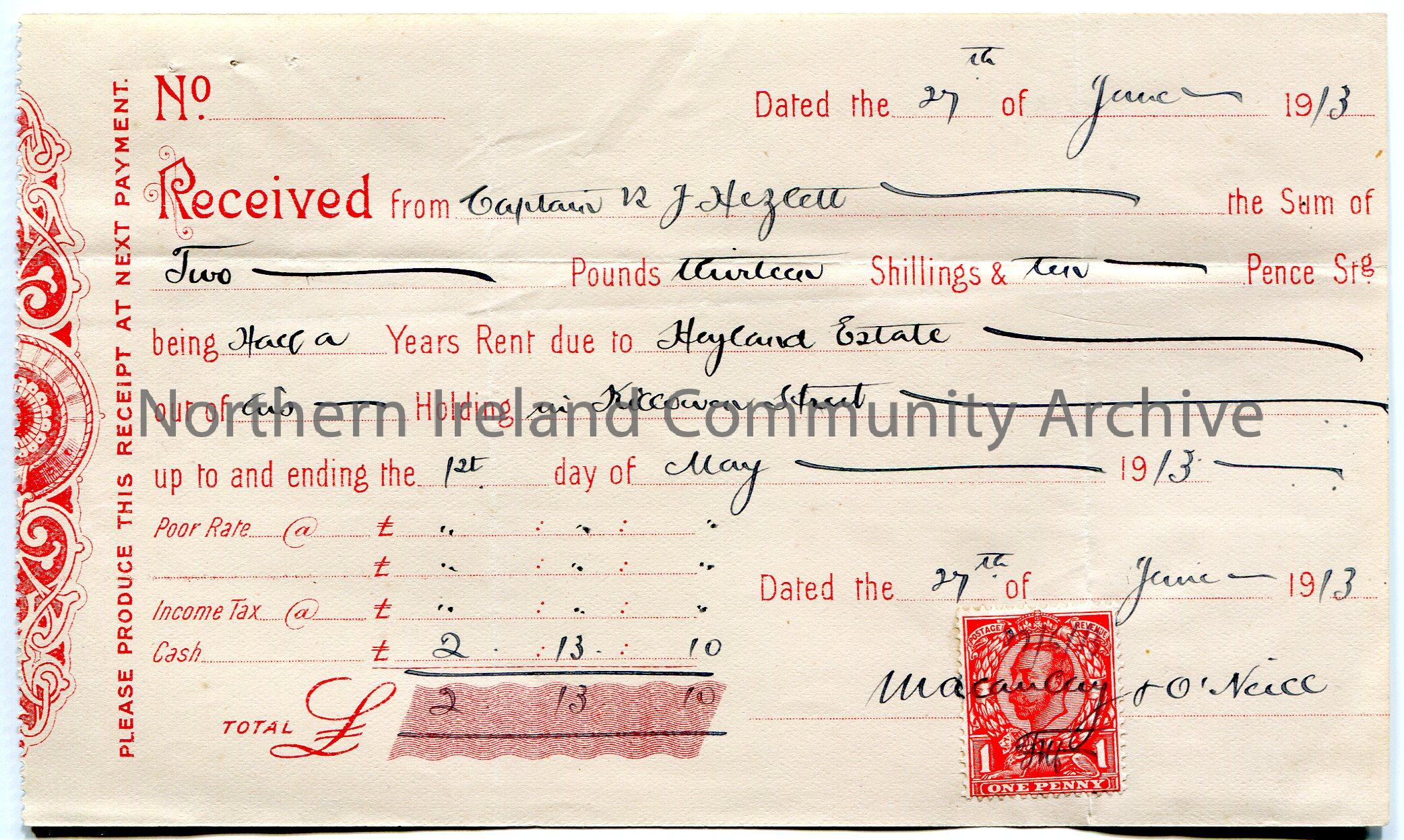 Handwritten receipt for payment received from Captain R J Hezlett [Hezlet] for the sum of £12.13.10. Payment for a half years rent due to Heyland Estate out of his holding in Killowen Street up to and ending 1st May, 1913. Receipt dated 27th June, 1913. Signed by Macaulay and O'Neill over red one penny George V postage stamp.