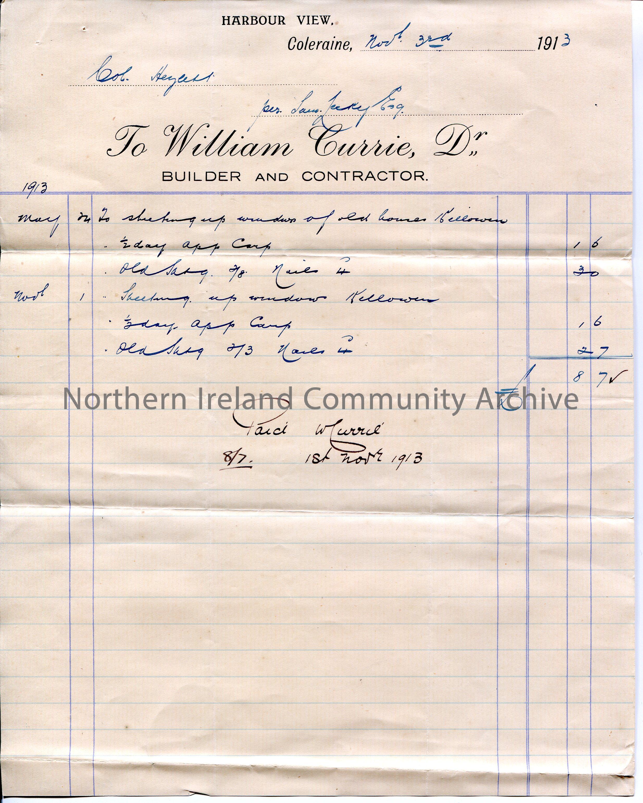 Handwritten receipt for payment received from Col. Hezlett [Hezlet] per Sam Lecky, esq to William Currie, builder and contractor. Receipt dated 3rd November 1913 for work on 24th May and 1st November 1913 re work on windows in 'old houses Killowen'. Sum of £0.8.7 paid on 1st November 1913. 'Curries' handwritten in pencil on back of page.