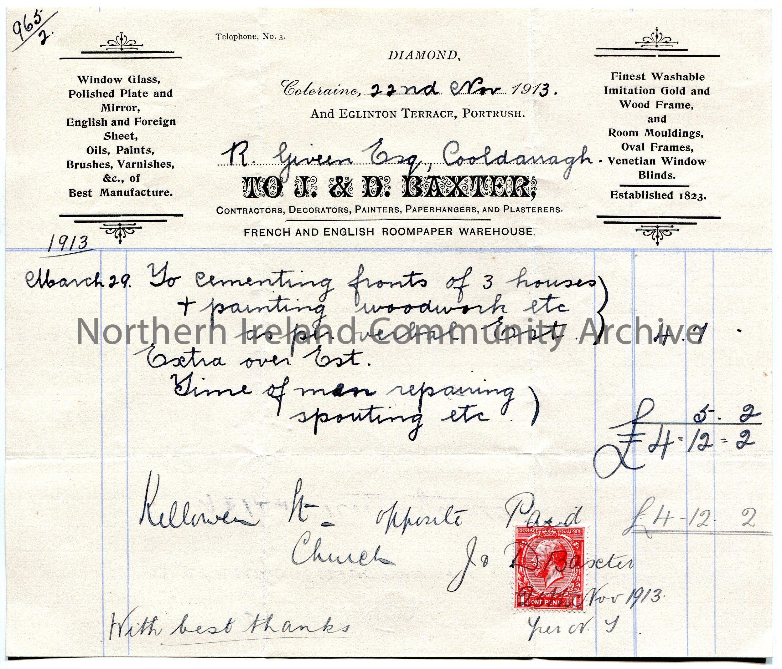 Handwritten receipt for payment received from R [Robert] Giveen Esq, Cooldanagh to J & D Baxter, Diamond, Coleraine and Eglinton Terrace, Portrush. Payment of £4.12.2 for work completed on 29th March 1913 - cementing front of 3 houses, painting woodwork and repairing of spouting. Notes that the houses were on Killowen Street, opposite Church. Paid on 25 November 1913. Receipt dated 22nd November 1913. 'Baxter' handwritten in pencil on back of page.