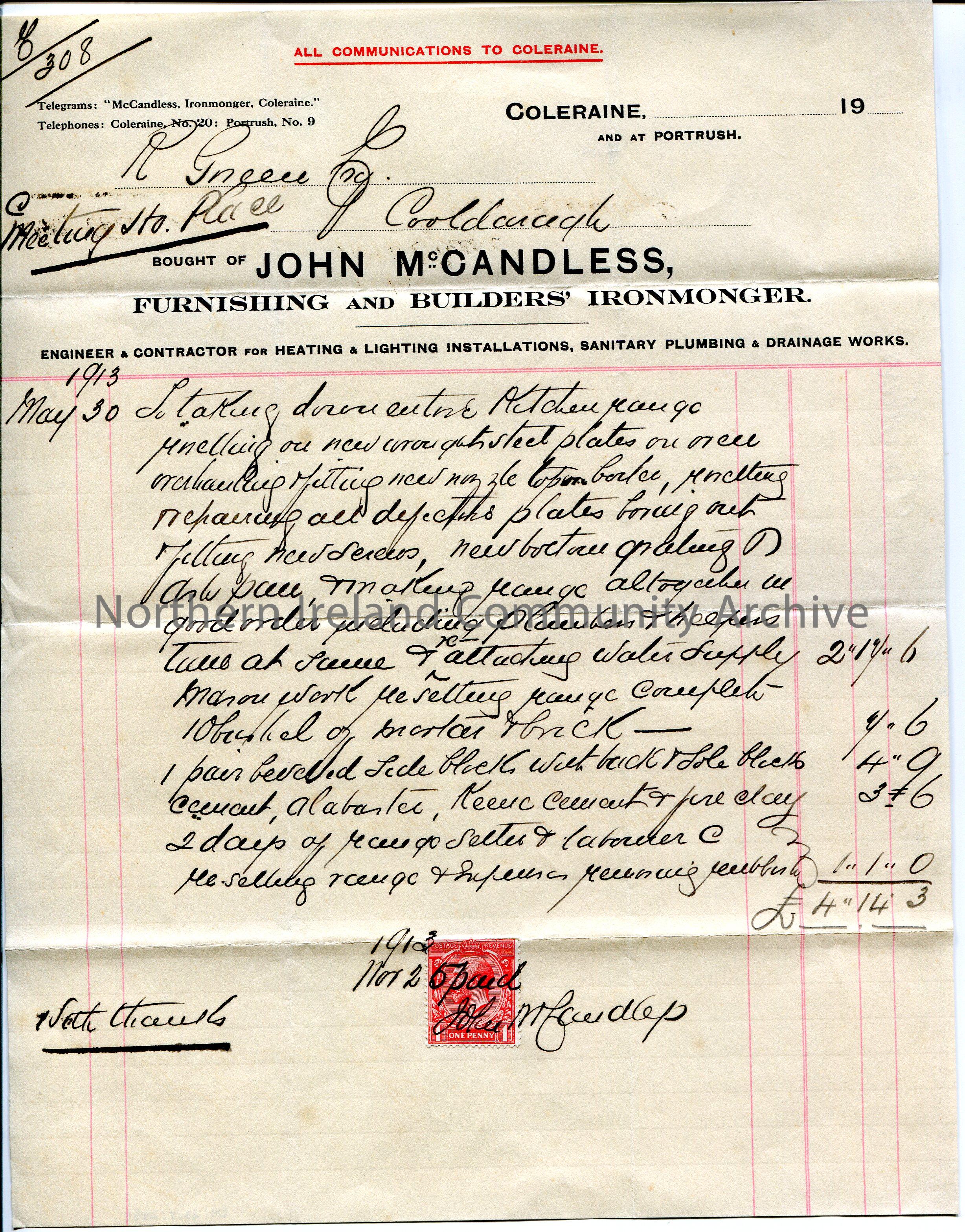 Handwritten receipt for payment received from R [Robert] Giveen, Esq, Cooldanagh to John McCandless, Ironmonger, Coleraine. 'Meeting Ho [House] Place' handwritten at top of page. For work on 30th May 1913 re work on a kitchen [handwriting illegible]. Sum of £4.14.3 paid on 25th November 1913. Red one penny George V postage stamp on lower half of receipt. 'McCandless' handwritten in pencil on back of page.