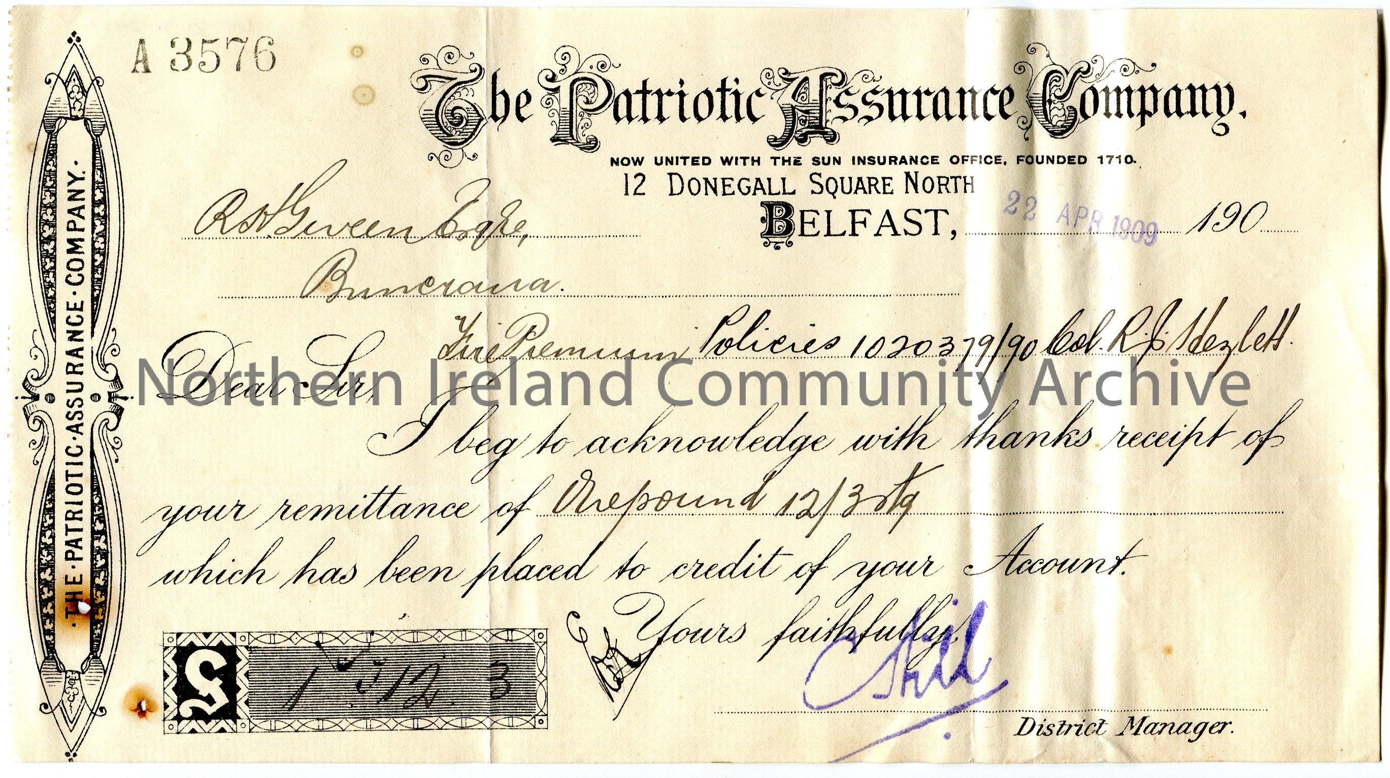 Handwritten receipt for payment to The Patriotic Assurance Company, 12 Donegall Square North, Belfast. Dated 22nd April, 1909. Made out to R Giveen, Buncrana on behalf of Col R J Hezlett [Hezlet] for the sum of £1.12.3. Signed by C Shill, District Manager.
