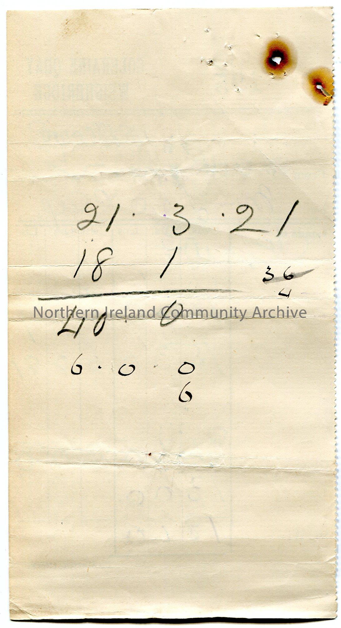 Handwritten receipt for straw at Coleraine Quay, Weighbridge. From Hu [Hugh] Conn for Mr [Samuel] Lecky. Dated 18th December, 1909. Receipt number 195. T Martin, Clerk. Handwritten calculation on back of receipt.