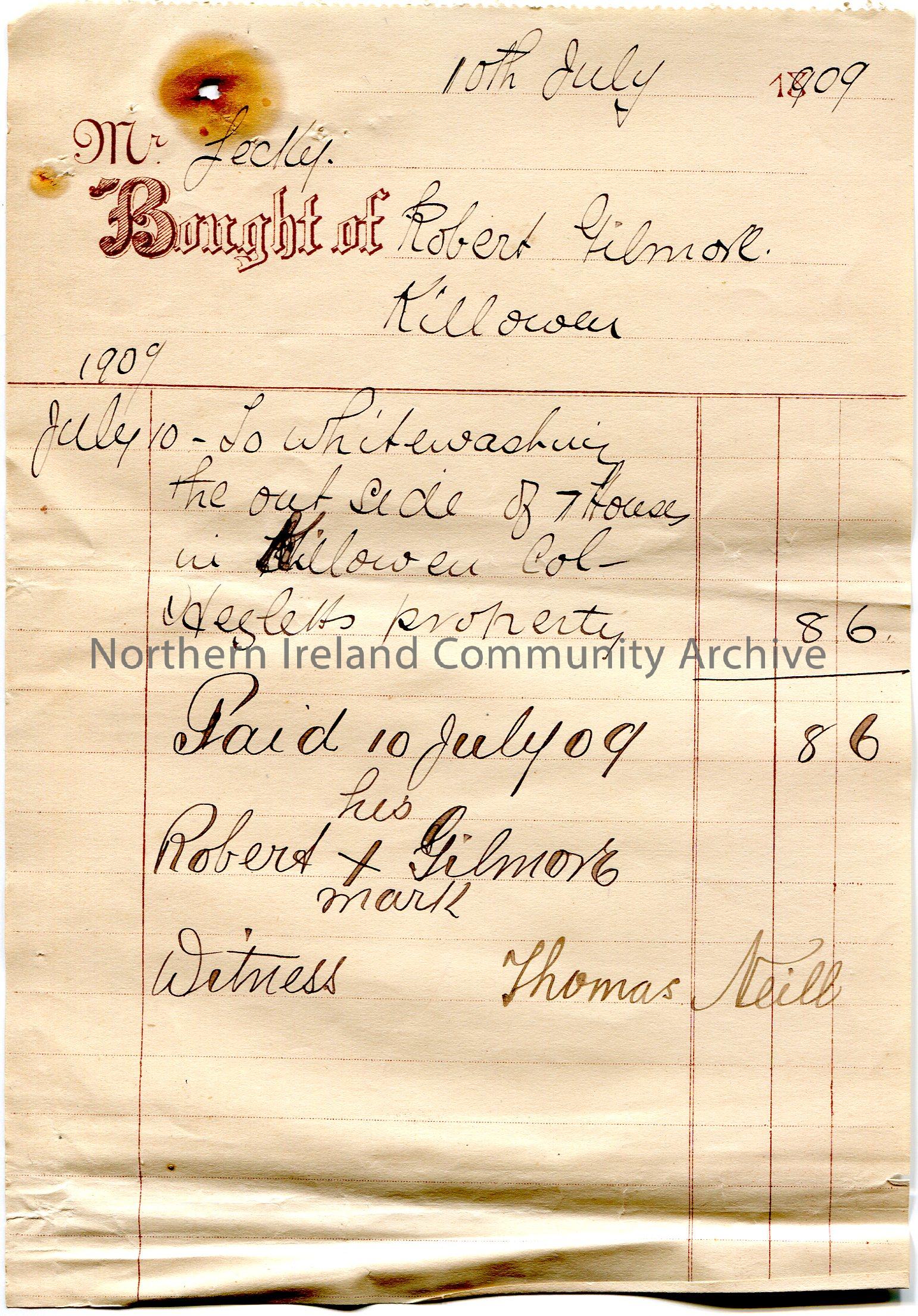 Handwritten receipt for the whitewashing of houses at Killowen belonging to Col Hezlett [Hezlet]. Paid to Robert Gilmore, Killowen from Mr Leckey. Totalling £0.8.6. Witness signed as Thomas Neill. Dated 10th July, 1909.