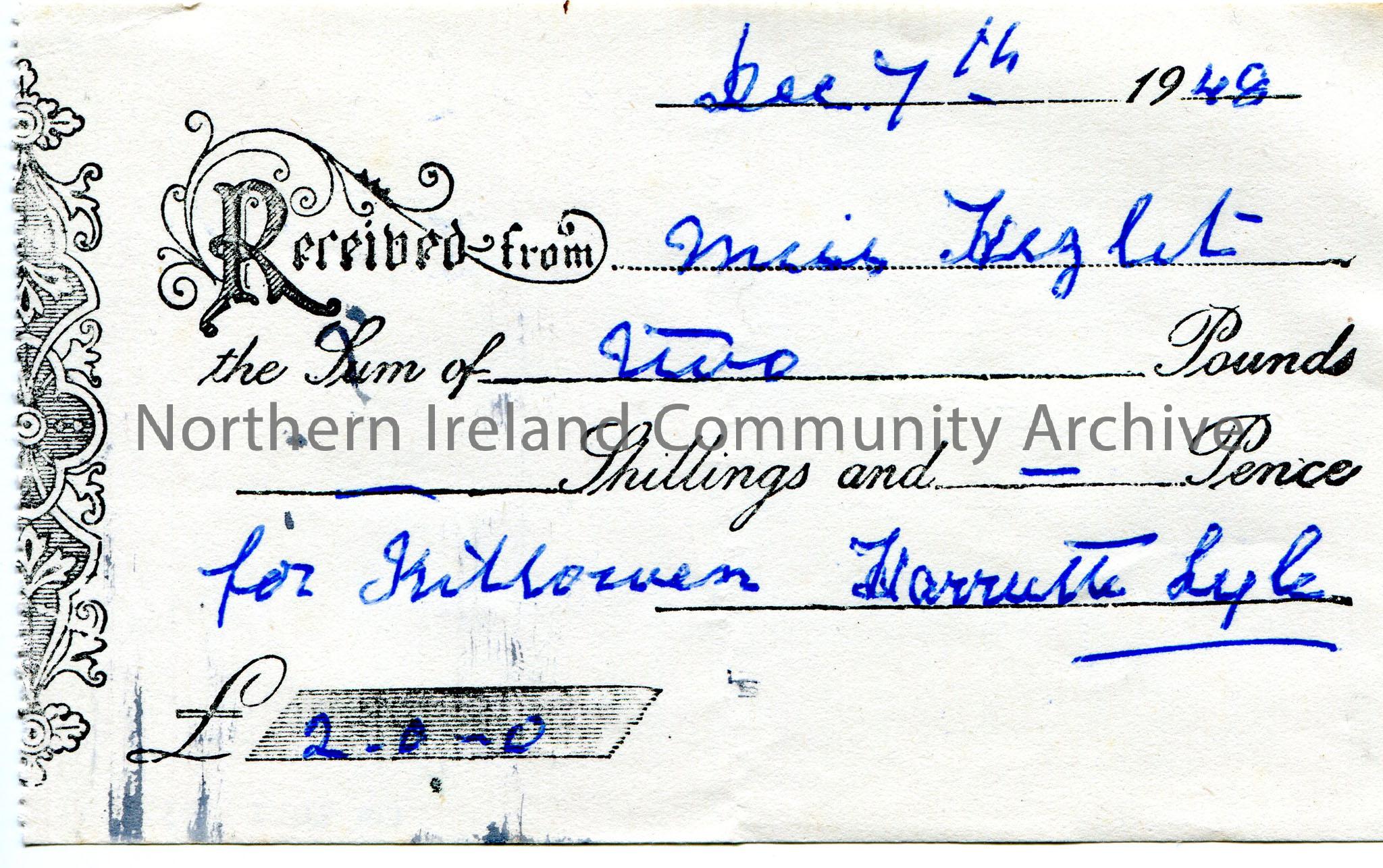 Handwritten receipt from Harriette? Lyle to Miss Hezlet for two pounds for Killowen. Dated 7th December, 1948.