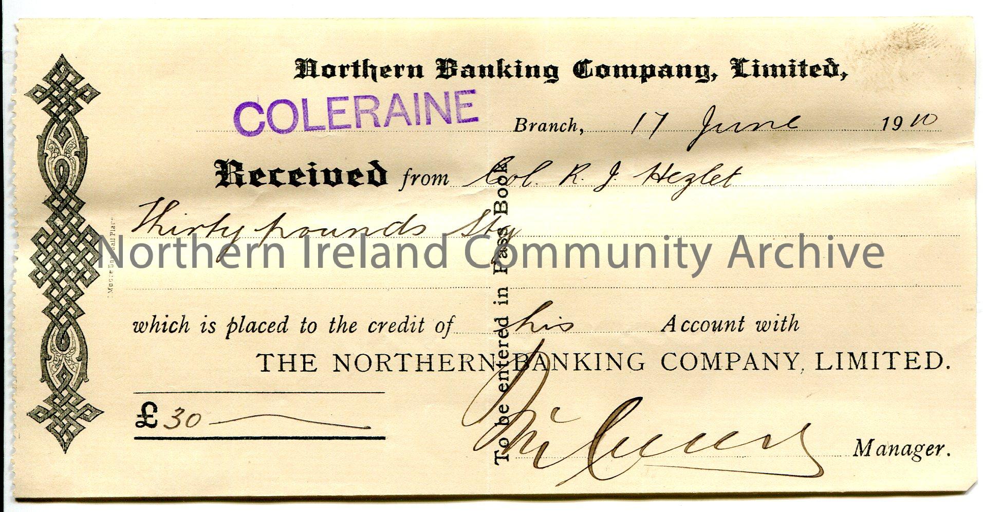 Handwritten receipt from Northern Banking Company, Limited, Coleraine branch for the credit of £30.0.0 in to the account of Col R J Hezlet. Signed by manager McCurry [?]. Dated 17th June 1910.