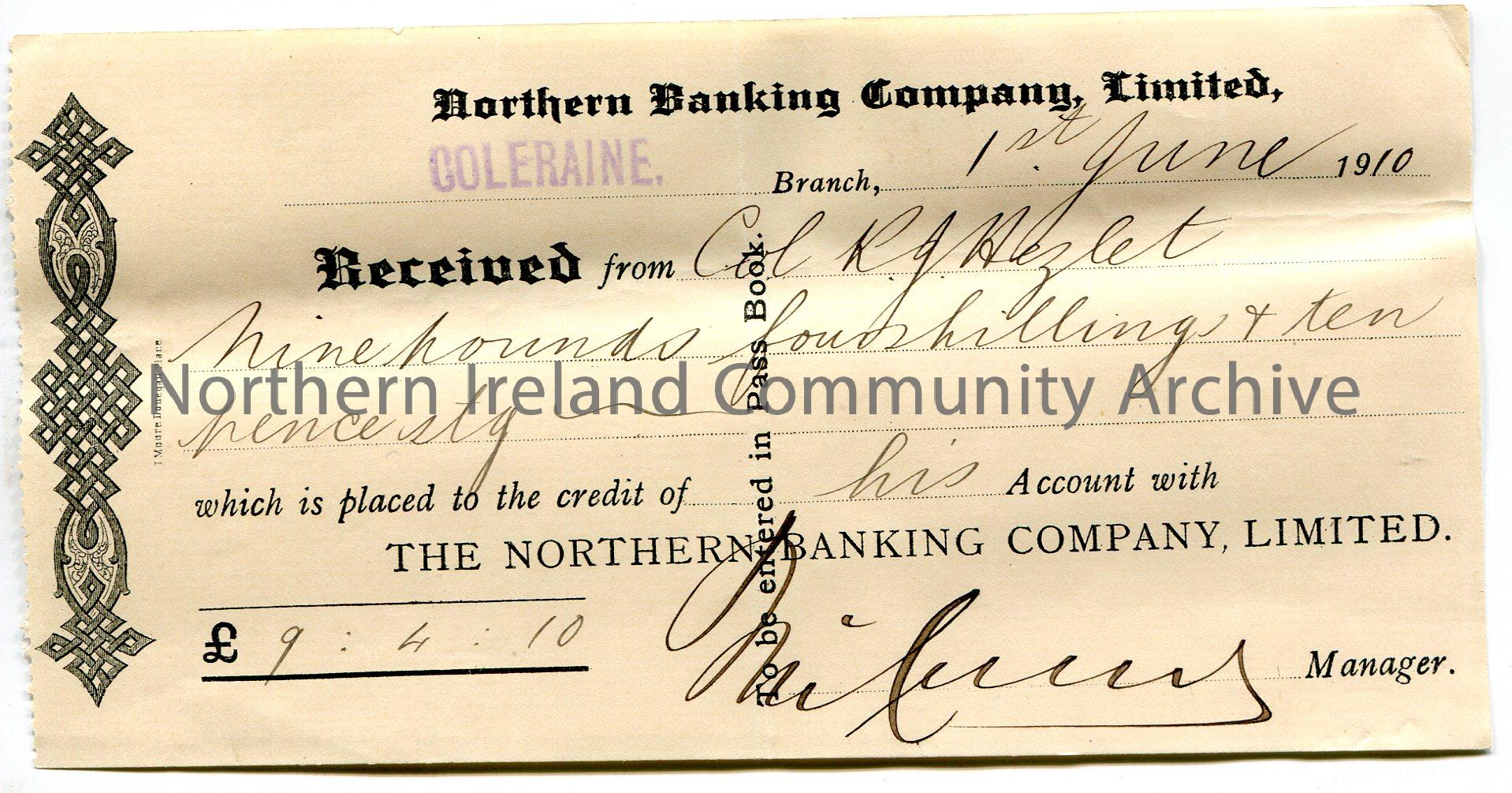 Handwritten receipt from Northern Banking Company, Limited, Coleraine branch for the credit of £9.4.10 in to the account of Col R J Hezlet. Signe…