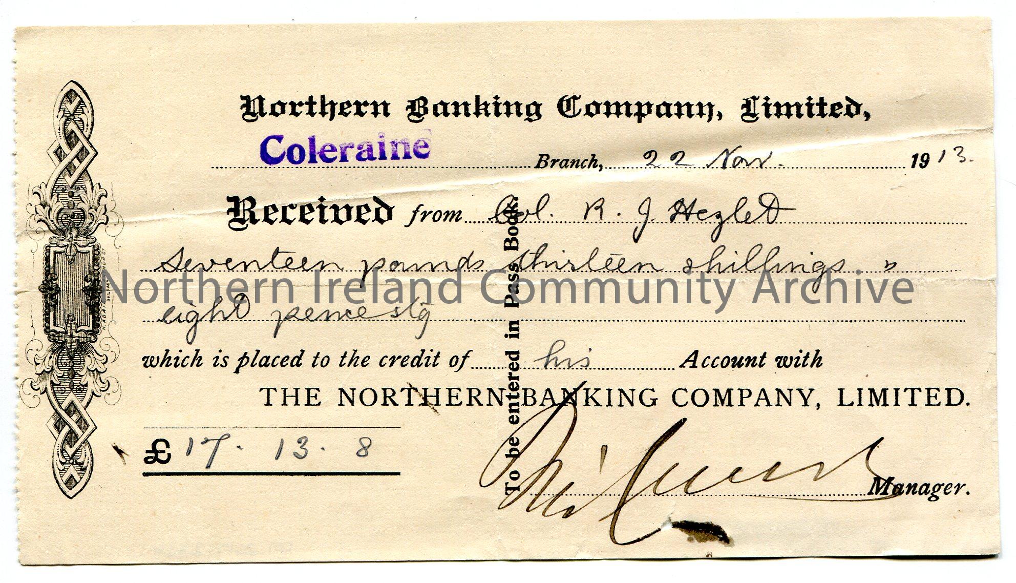 Handwritten receipt from the Northern Banking Company, Limited, Coleraine branch for credit of £17.13.8 into the bank account of Col. R. J. Hezle…