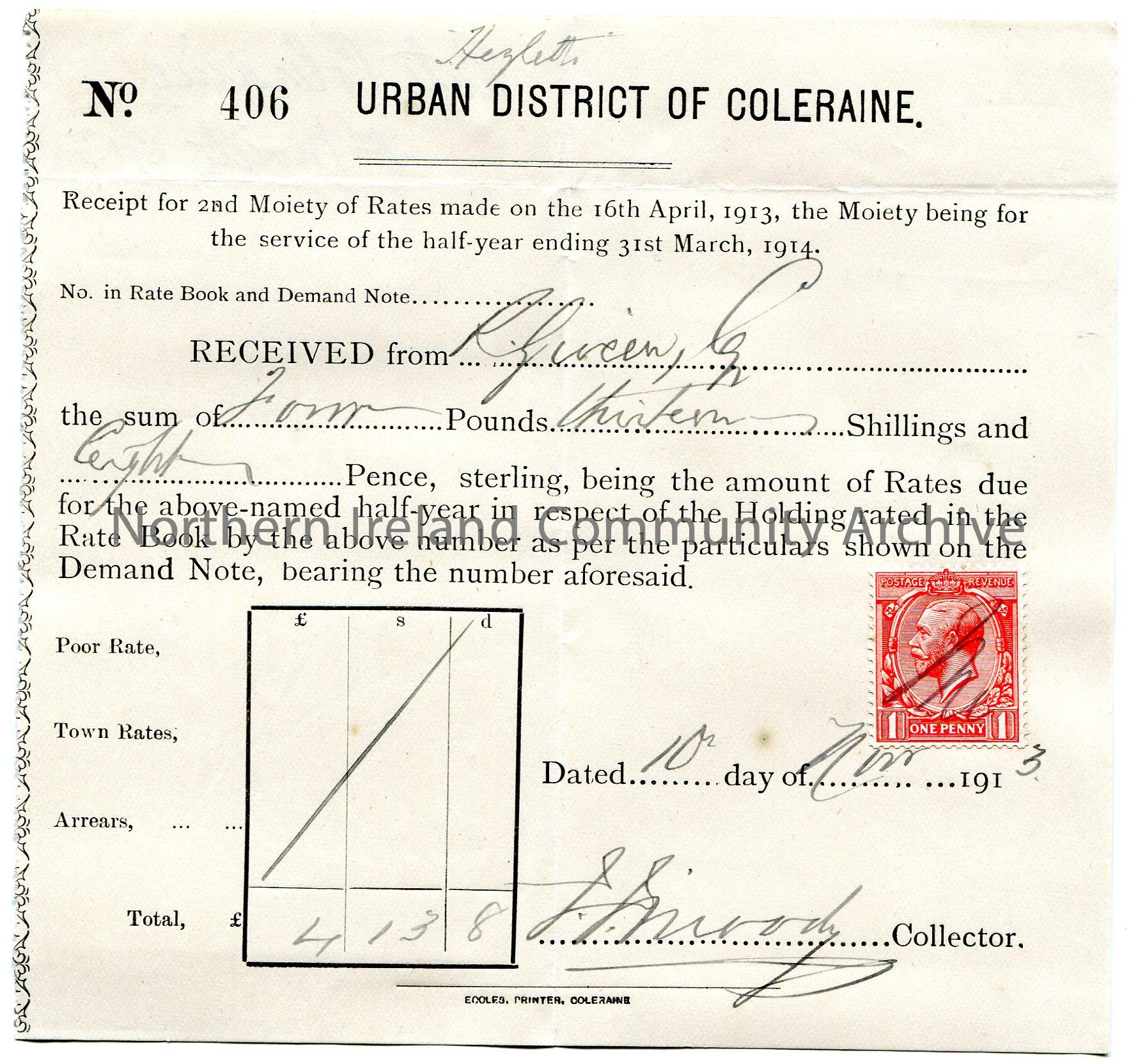 Handwritten receipt, No. 406, for 2nd Moiety of Rates for half year ending 31st March, 1914. 'Hezletts' handwritten at top of page. Payment received from R [Robert] Giveen for the sum of £4.13.8. Paid on 10th November, 1913. Signed by J. Moody, Collector. Red one penny King George V postage stamp stuck to page. 'Rates Coleraine 2nd Moiety 1913' handwritten on back of page.