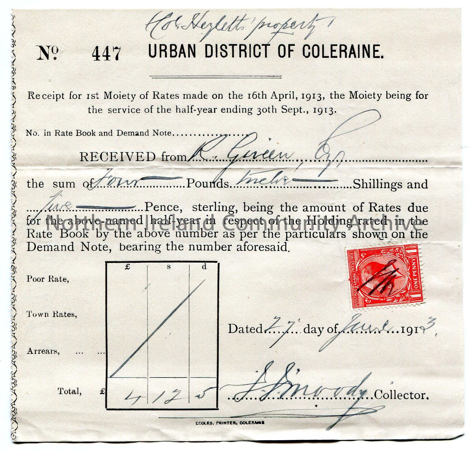 Handwritten receipt, No. 447, for 1st Moiety of Rates for half year ending 30th September, 1913. Payment received from R [Robert] Giveen, Esq., for the sum of £4.12.5. Paid on 27th June, 1913. Signed by J. Moody, Collector. 'Col Hezlett's property' handwritten at top of page. Red one penny King George V postage stamp stuck to page.